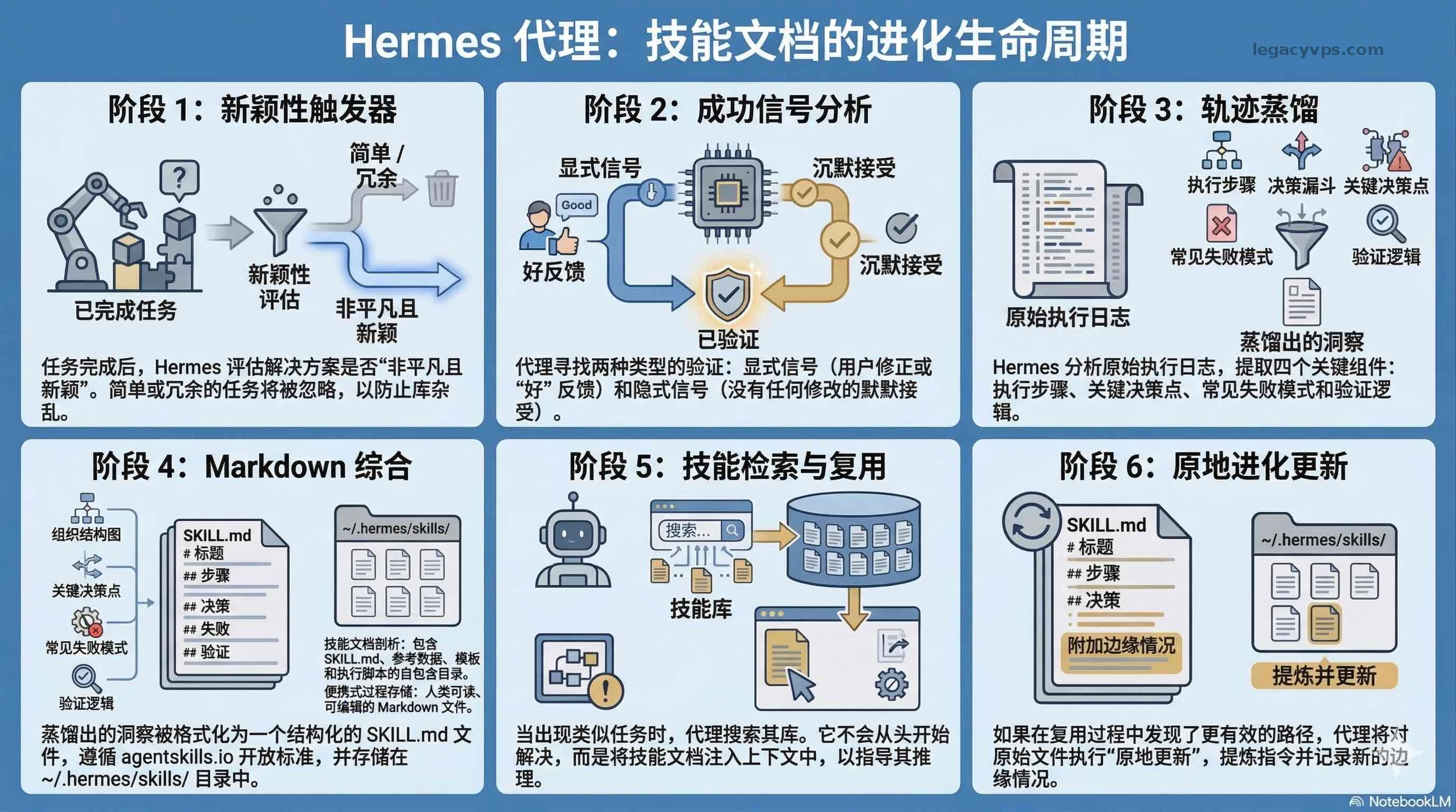 提炼内容 :从执行轨迹里抽取:执行步骤、关键决策点、常见失败模式、验证逻辑,打包成一个有名字的 Markdown 文件(存在 ~/.hermes/skills/ 下)。文件格式遵循 agentskills.io 开放标准,可以装别人沉淀好的技能,也可以把自己的共享出去。