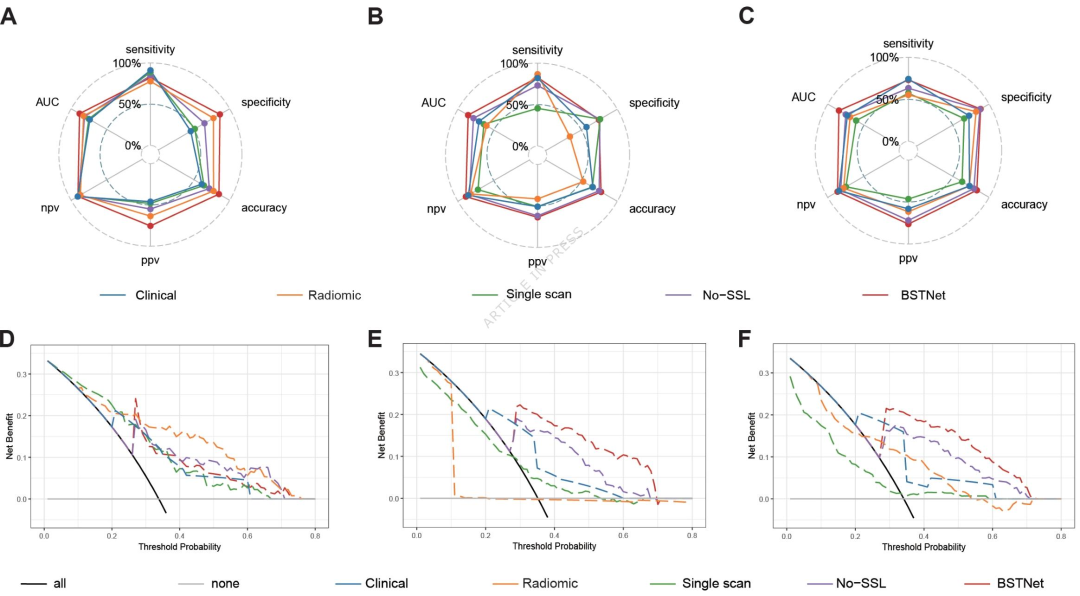 ③临床效用:决策曲线分析显示,在0.3-0.7阈值概率范围内,BSTNet在外部验证队列中的净获益显著高于其他模型,优于"治疗所有患者"或"不治疗任何患者"的基线策略。