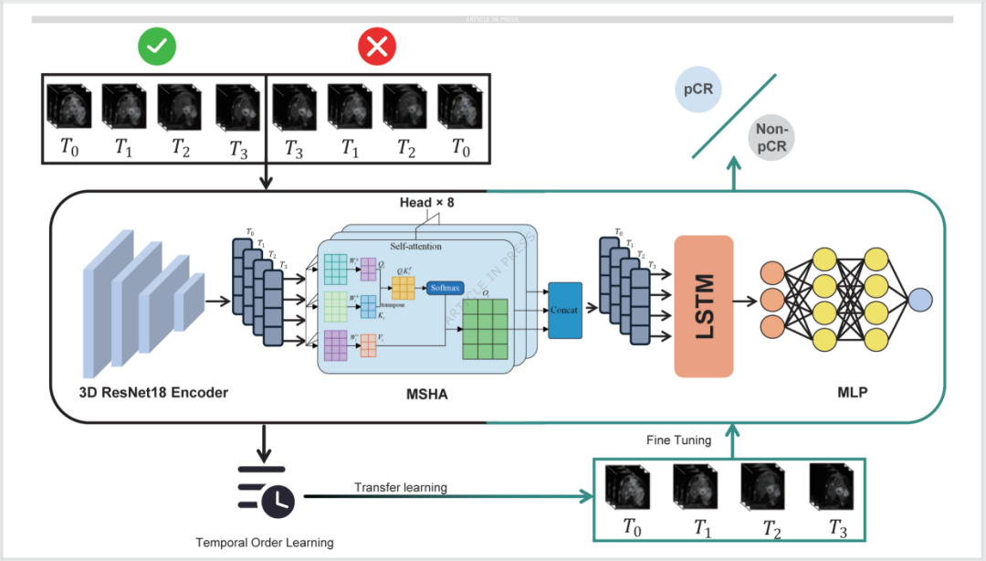 自监督预训练:利用662例患者的3-4个时间点序列(T0:治疗前;T1:1周期后;T2:4周期后;T3:术前),通过"时间序列置换"生成2648个增强样本(1个原始序列+3个随机排列序列),让模型学习时间逻辑关系,无需额外标注。