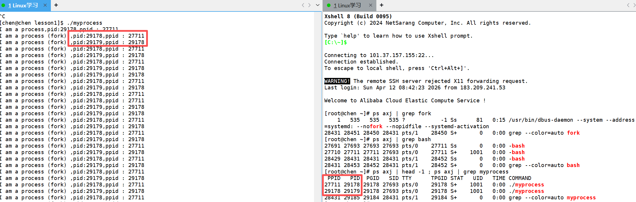 大家会发现,连续的两个fork后的printf语句打印出来的 PID 和 PPID 属于是父子关系,我们通过查看进程,发现也确实存在两个./myprocess ,那么第一个./myprocess的父进程又是谁呢?