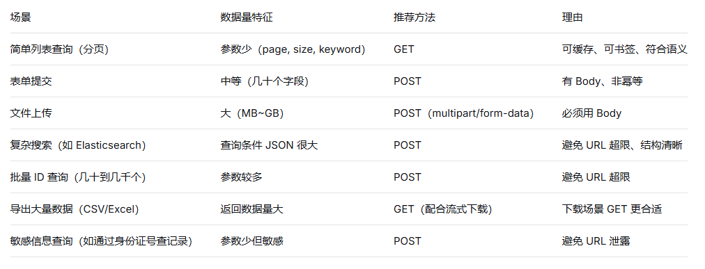 当然,如果查询条件简单且可以缓存,仍应优先使用 GET 以符合 RESTful 语义。总之,方法的选择不应死守教条,而应基于数据量、安全性、缓存需求等实际因素做出决策。"