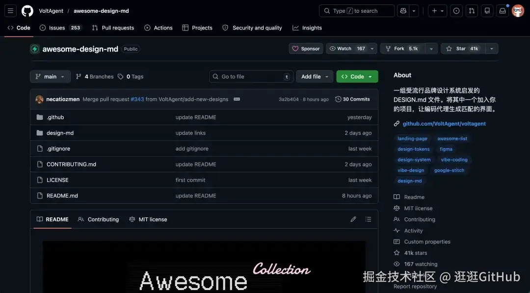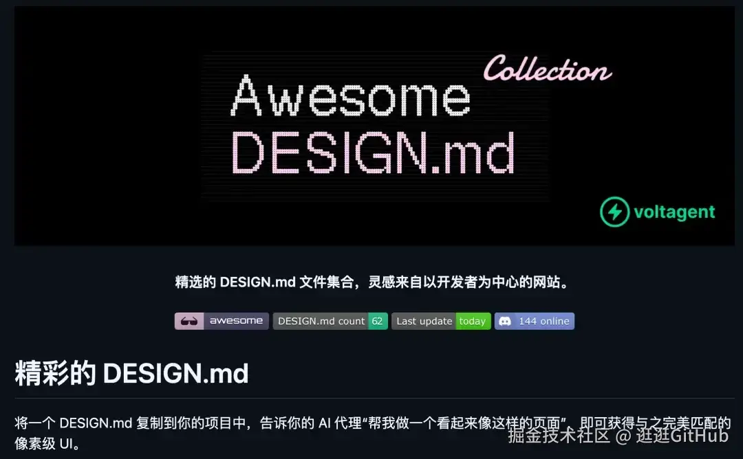 这个项目叫 awesome-design-md,是 VoltAgent 团队做的。