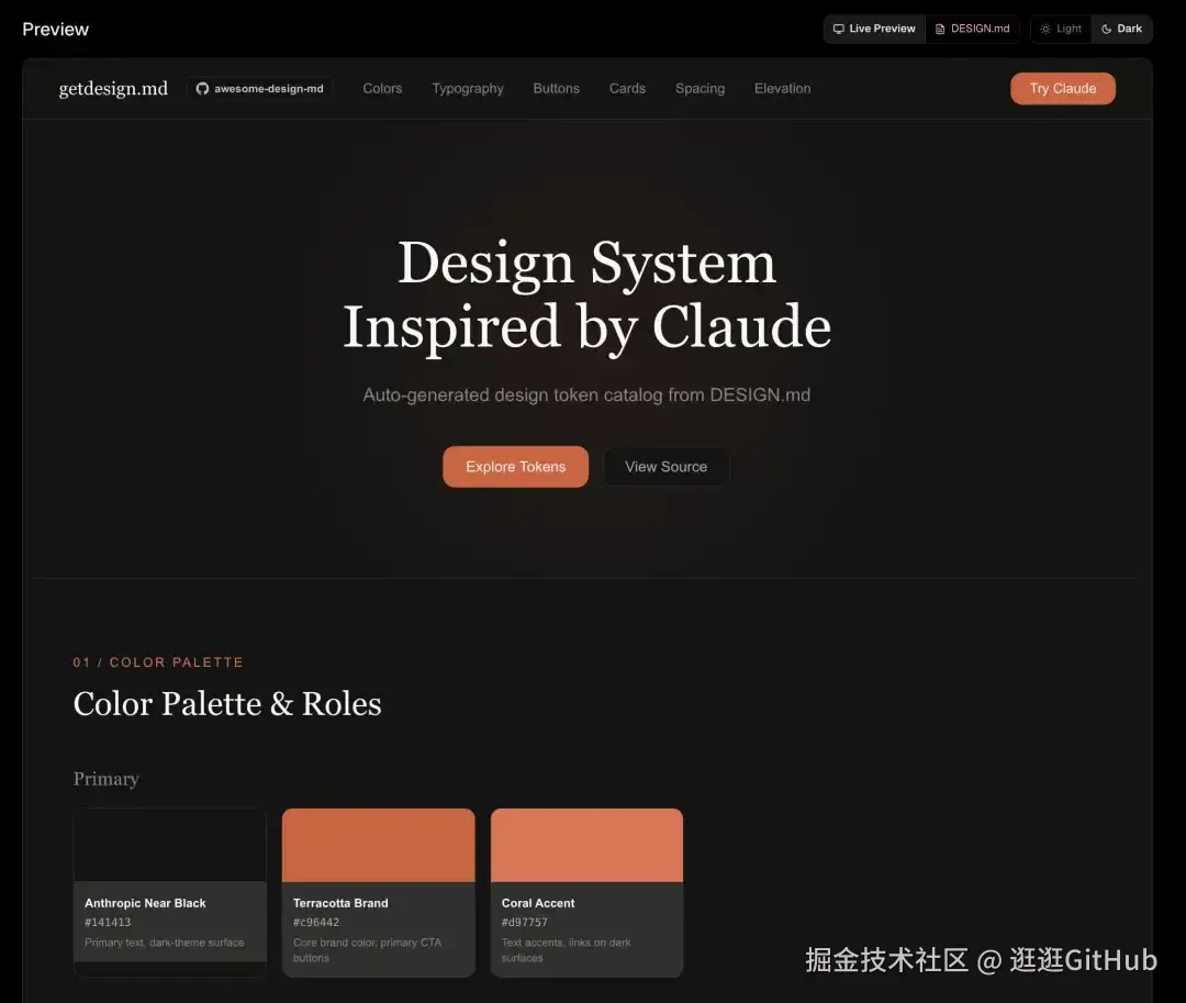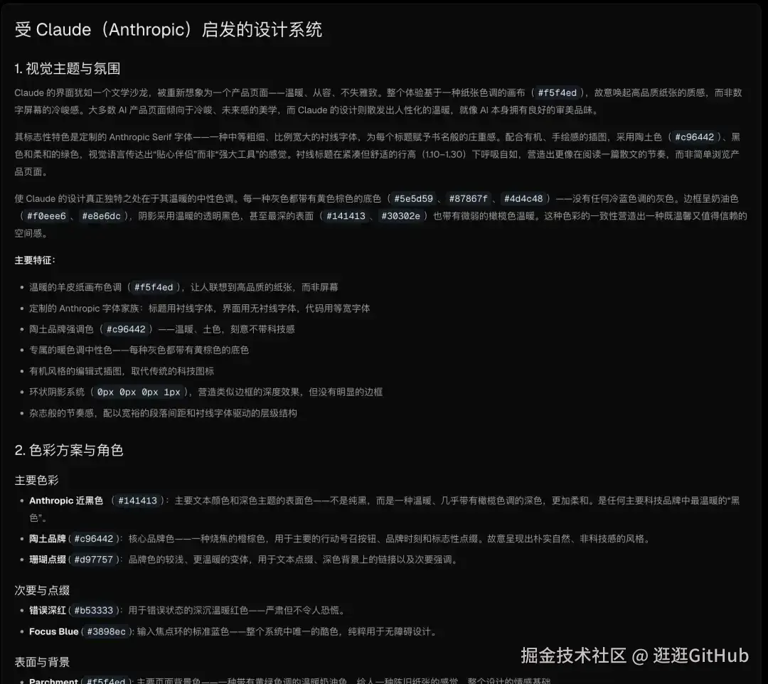 就是用纯 Markdown 来描述一个网站的视觉语言,包括颜色、字体、间距、阴影、组件样式这些,格式天然适合 AI 阅读。