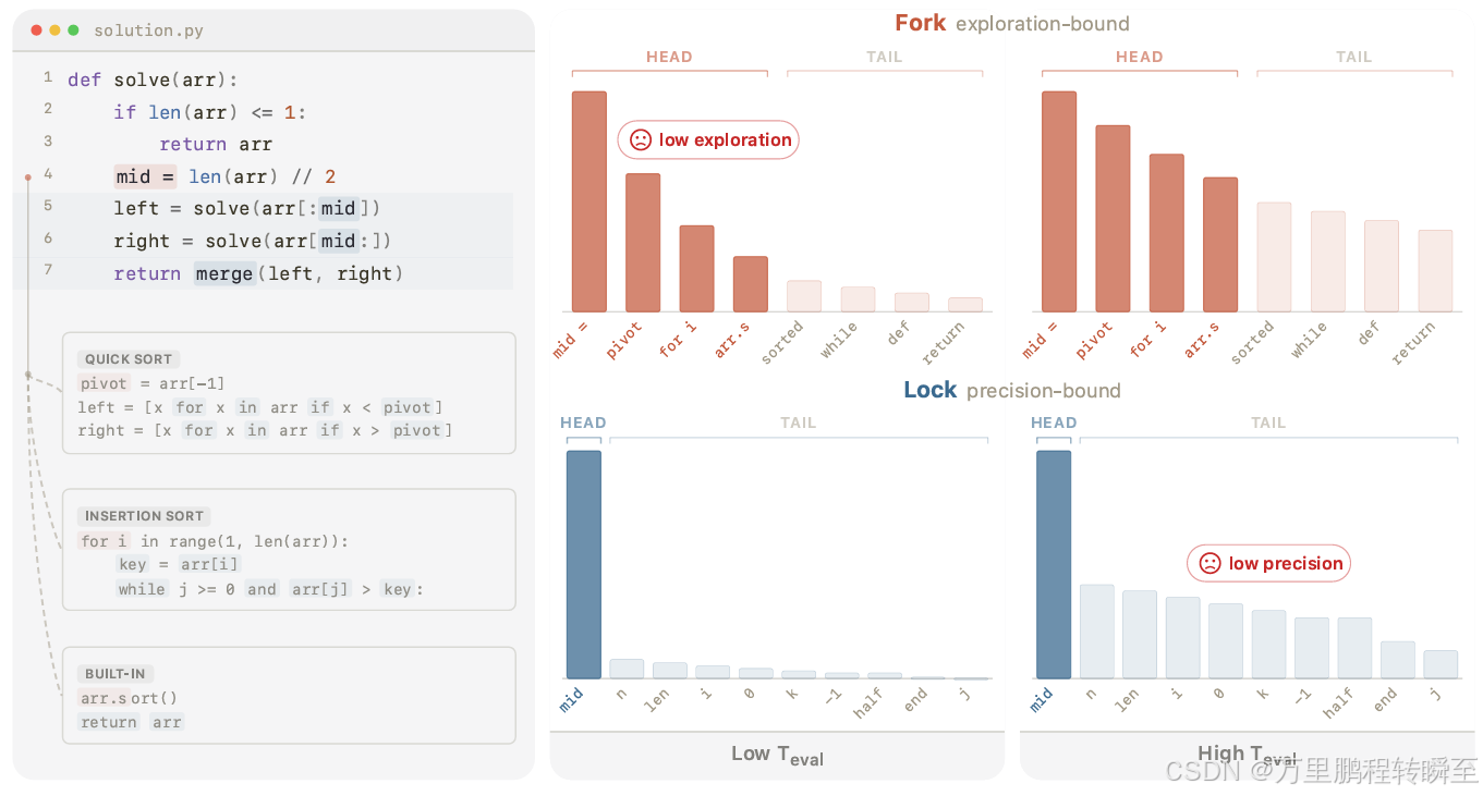 单一的评估温度无法同时满足分叉位置的探索需求 与锁定位的精度需求 。左侧:一个排序算法示例,其中算法选择词元 为分叉位置 (锈橙色),后续对 mid 的使用则为锁定位 (蓝色);灰色虚线路径代表在该分叉点可选择的其他有效算法。右侧:在低 / 高评估温度 下,上述两类上下文对应的词元概率分布,头部与尾部概率均明确标出。低评估温度能保证锁定位精准,但会导致分叉点的有效头部分布坍塌(探索能力不足);高评估温度能恢复分叉点的探索能力,却会让锁定位的干扰尾部概率重新激活(精度下降)。