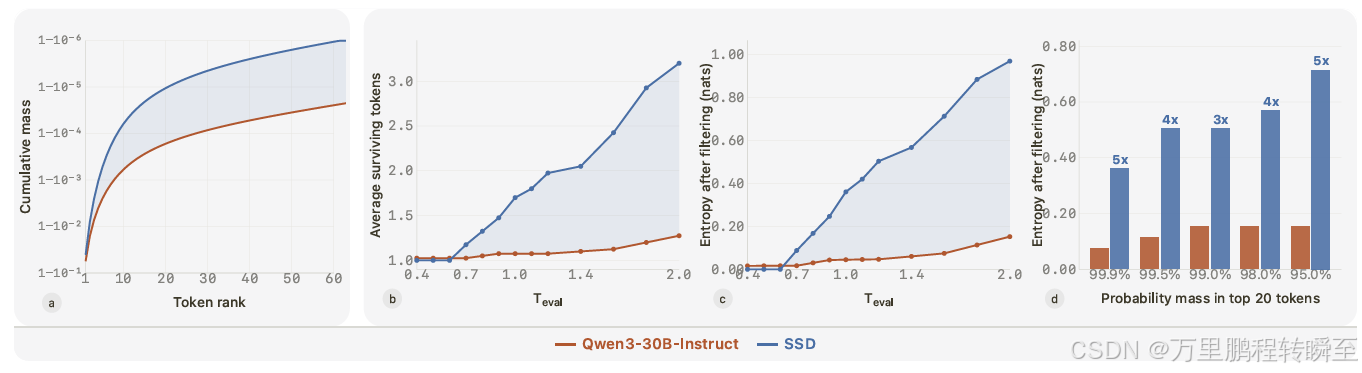 (a) 当词元按模型概率排序时,SSD 模型的累积概率上升更快,说明其概率头部更干净、弥散的尾部更弱。(b) 随着 Teval 升高,经过截断后,SSD 模型保留的有效词元多于基础模型。(c) 截断后的分布熵在 SSD 模型上提升幅度显著更大。(d) 即便两个模型在前 20 个词元上的累积概率相近,SSD 截断后的熵依然更高,为推理阶段的探索提供了更多可行候选。