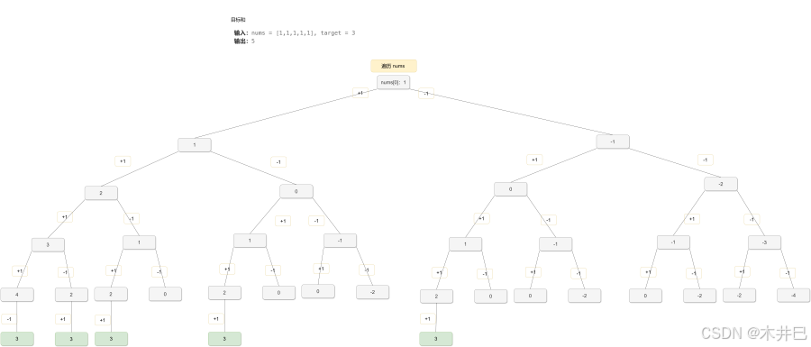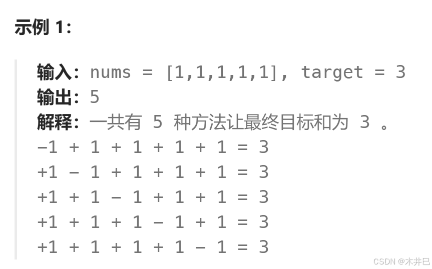 例如,nums = [ 1, 1, 1, 1, 1 ],target = 3。我们需要对 nums 数组中的每一个数字添加符号 "+" 或 "-" ,使得 nums 中的数字之和等于 3。能够满足的组合:+1+1+1+1-1 = 3;+1+1+1-1+1 = 3;+1+1-1+1+1 = 3;+1-1+1+1+1 = 3;-1+1+1+1+1 = 3。因此共有五种,返回 5。