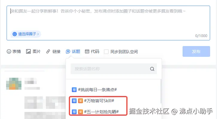 在 "沸点" 编辑好想要发布的内容后,点击并选择对应互动话题即可成功添加啦~
