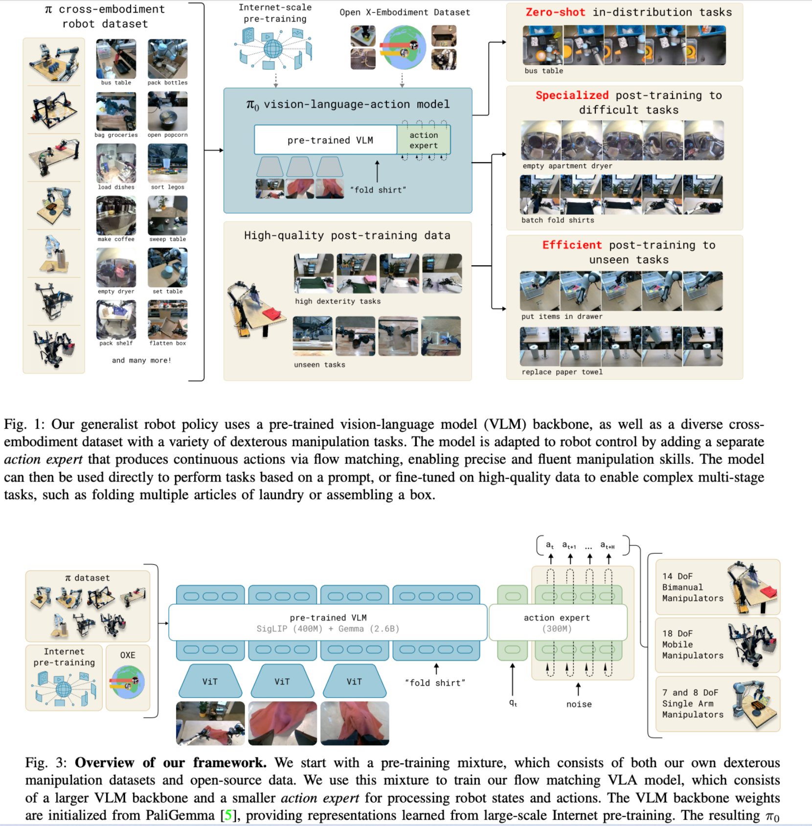 如果说前两个阶段解决的主要是"VLA 范式能不能成立"以及"训练数据从哪里来"的问题,那么到了 2024 年末至 2026 年前后,VLA 研究则进入了一个明显的爆发期。这个阶段最突出的特征,是研究重心开始从"搭建开放基座"和"扩充训练数据"进一步转向"如何让 VLA 真正具备开放世界泛化、连续动作建模、长程推理与跨本体部署能力"。在这一意义上,Physical Intelligence 推出的 π₀ (Our First Generalist Policy) 可以被视为这一阶段的标志性起点。与早期依赖离散动作 token 的 VLA 不同,π₀ 采用了建立在预训练视觉---语言模型之上的 flow matching 架构,以连续生成方式建模机器人动作分布,并在单臂、双臂以及移动操作等多种平台数据上联合训练,直接面向衣物折叠、桌面清理、装箱等更复杂、更灵巧的真实任务。它的重要性不只在于性能提升,更在于明确释放出一个信号:VLA 的竞争,正在从"谁先把大模型接上机器人"转向"谁能把大模型真正训练成可用的连续控制系统"。
