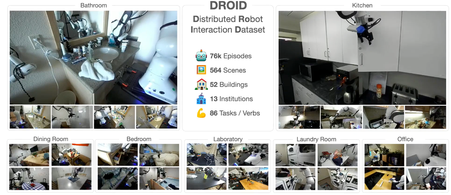 与此同时,Open X-Embodiment / RT-X(Open X-Embodiment: Robotic Learning Datasets and RT-X Models) 则率先从数据层面打破了实验室壁垒,该项目整合了 21 家机构、22 种机器人 embodiment、60 个已有数据集以及 100 万条以上真实机器人轨迹,第一次构建起一个面向通用机器人学习的开放、多本体、多任务数据底座。它的意义不只是"规模更大",而在于把此前分散在不同实验室中的机器人数据统一到了同一个生态之下,让通用机器人模型不再只能依赖单一实验室的封闭数据进行训练。