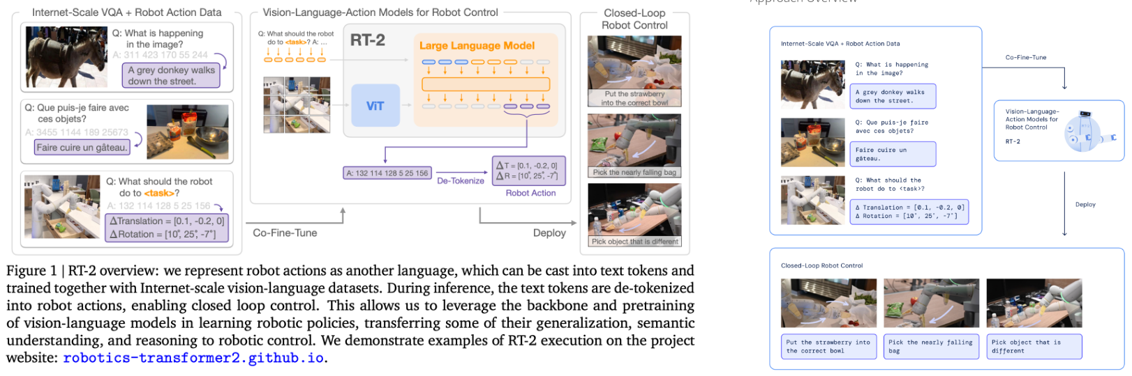 而随后发布的RT-2(RT-2: Vision-Language-Action Models Transfer Web Knowledge to Robotic Control)模型更进一步,确立了现代VLA的基本范式,他将具身控制策略与互联网级视觉-语言预训练模型(VLM)进行了深度融合,通过联合微调互联网规模的图文数据与机器人轨迹数据,赋予了机器人强大的语义推理与跨环境泛化能力 。