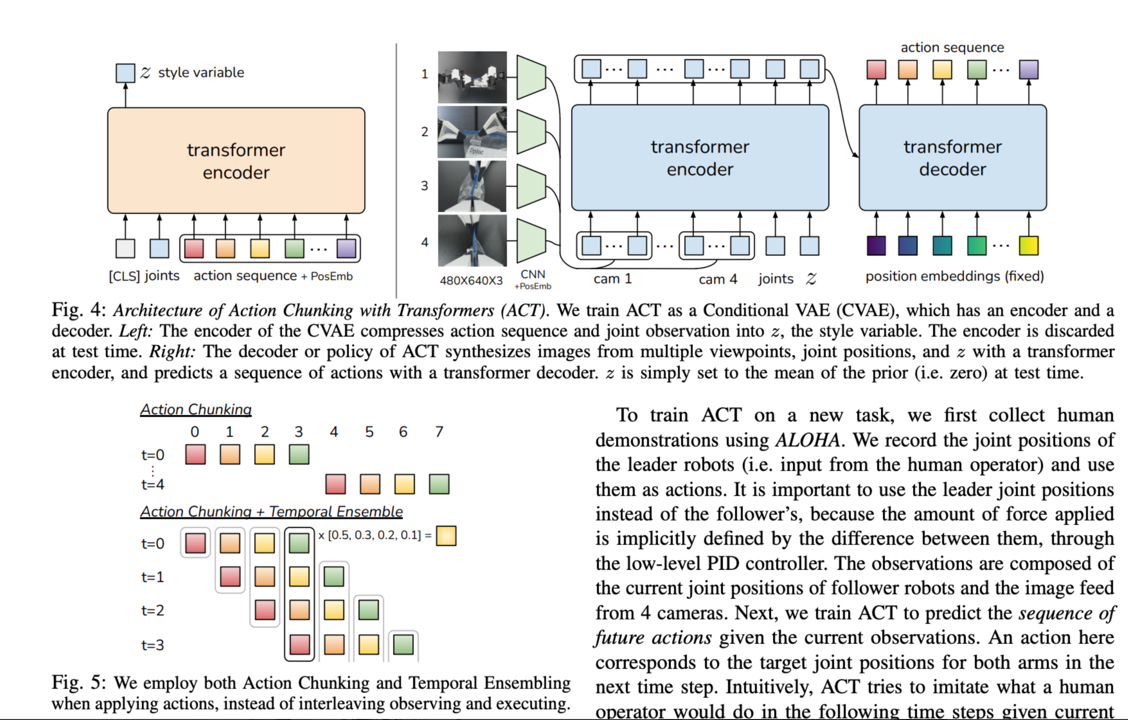 但 RT 系列解决的更多是"范式能否成立"的问题,真正进入双臂具身场景后,研究者首先遇到的反而不是模型结构,而是数据从哪里来、双臂操作模型怎么学的问题 ,于是紧接着,斯坦福团队在 2023 年推出了 ALOHA (Mobile ALOHA: 使用低成本全身遥操作学习双臂移动操作)低成本双臂平台,并同时提出了 ACT(Action Chunking with Transformers:Learning Fine-Grained Bimanual Manipulation with Low-Cost Hardware),这一模型虽然并不是属于严格意义上的VLA(属于VA模型),但它首次系统性地降低了双臂示教与模仿学习的门槛。ALOHA让双臂数据采集变得低成本、可复制,而ACT则通过动作块预测和条件变分建模缓解了精细操作中误差累积与演示多样性带来的学习困难,使机器人能够在较少示教样本下完成插拔、装配和双手协同等高精度任务。(到 2024 年,ALOHA升级为Mobile ALOHA,又进一步把这条路线从静态桌面任务扩展到 whole-body 移动双臂操作)