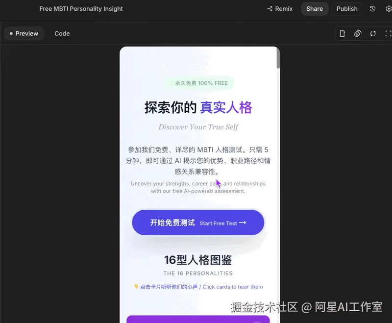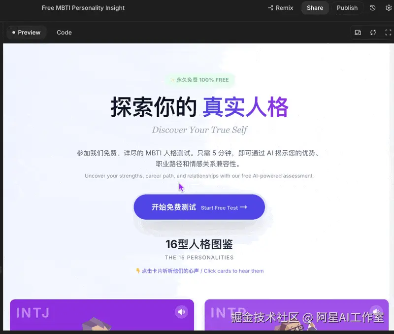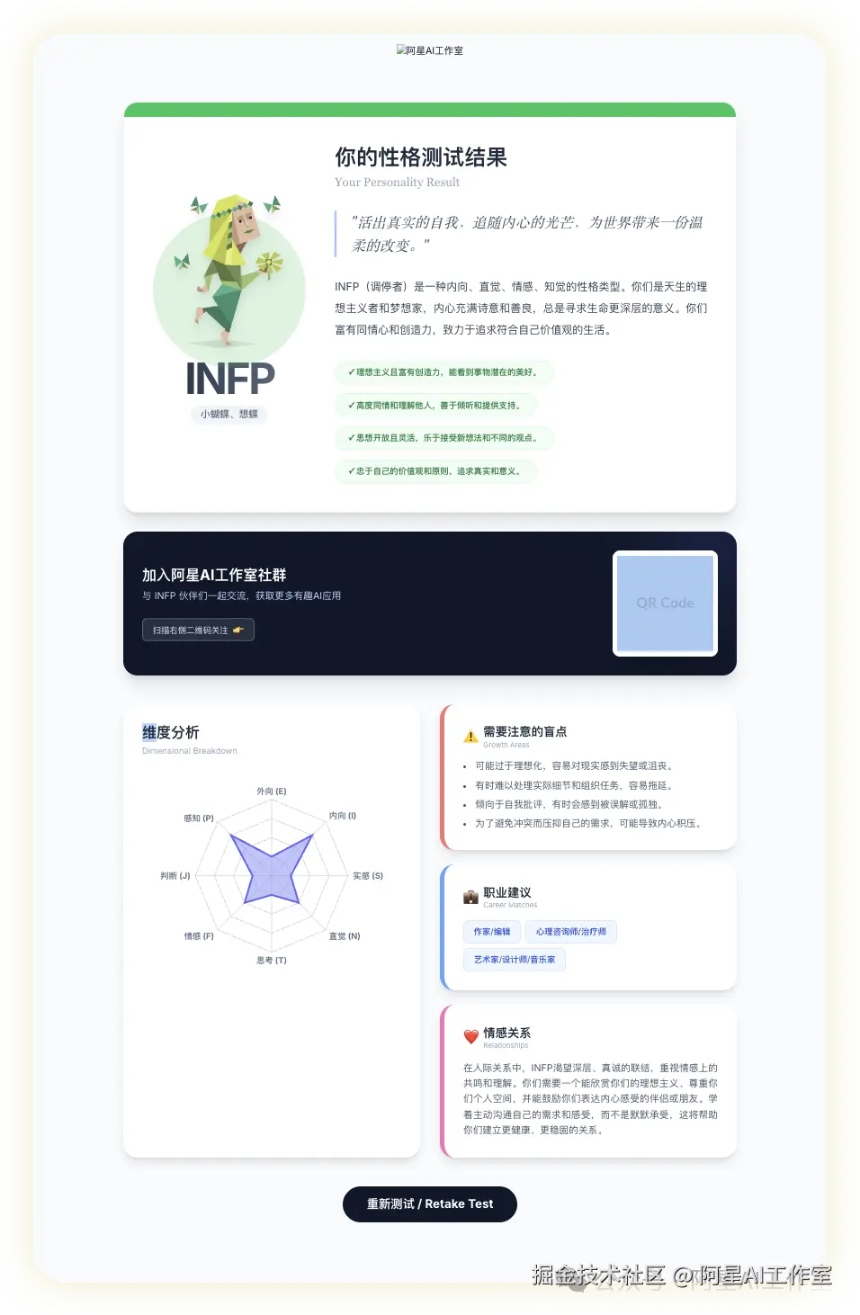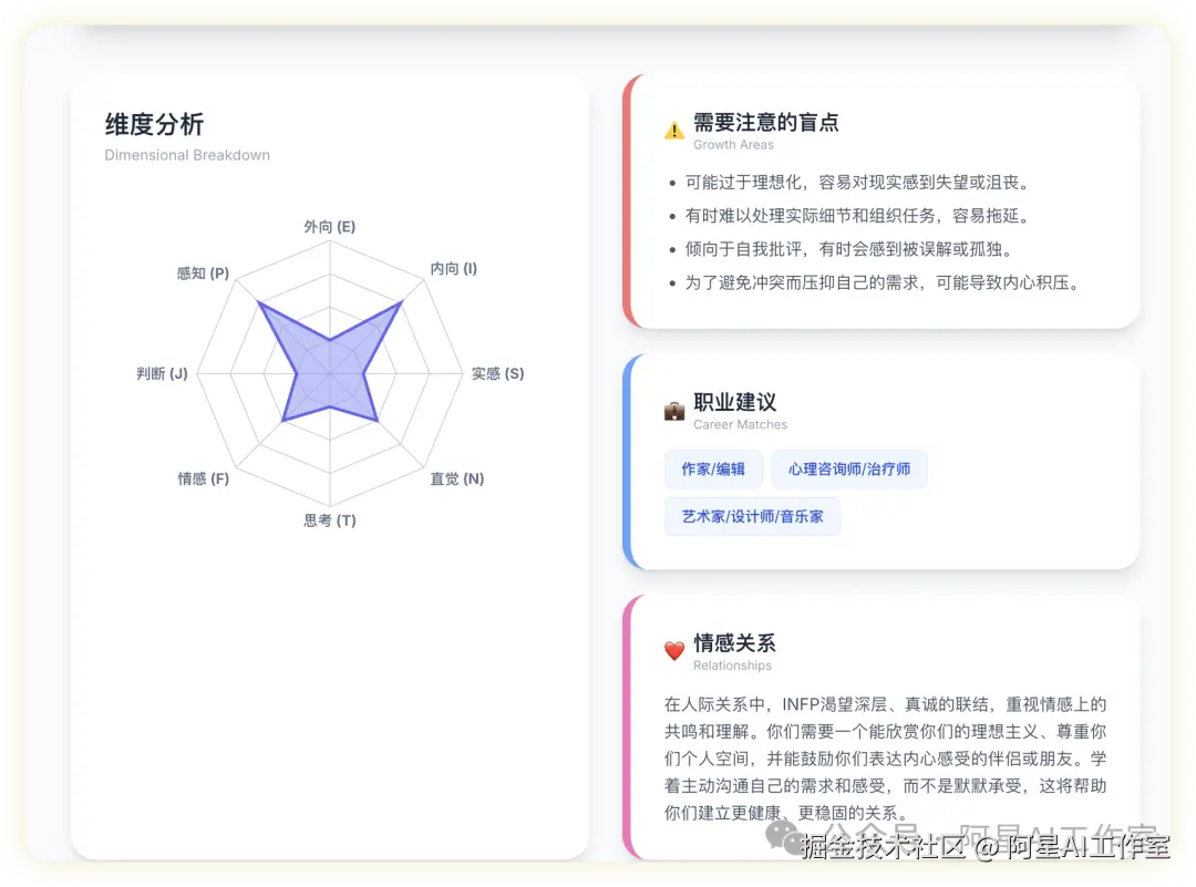 Report 页面的内容全部是 AI 生成的,这么设计是为了避免"千人一面"------比如你是 J 人但 P 的得分也高,它就会在报告里说明:"虽然你是 J 人,但你的 P 方面是怎样怎样的"。
