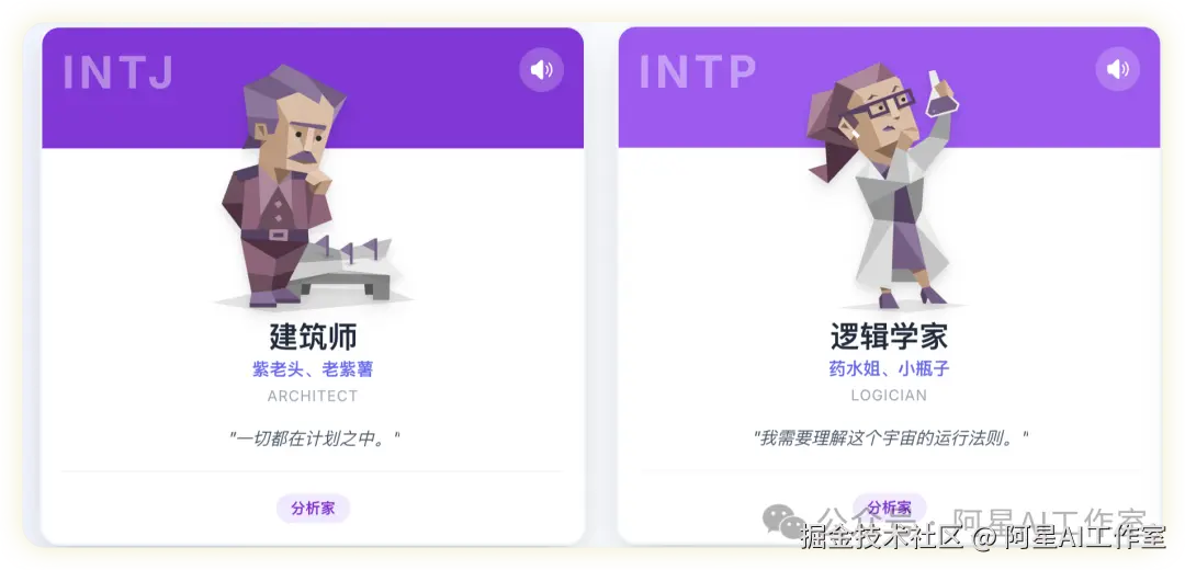角色展示: 展示 16 种 MBTI 人格卡片。