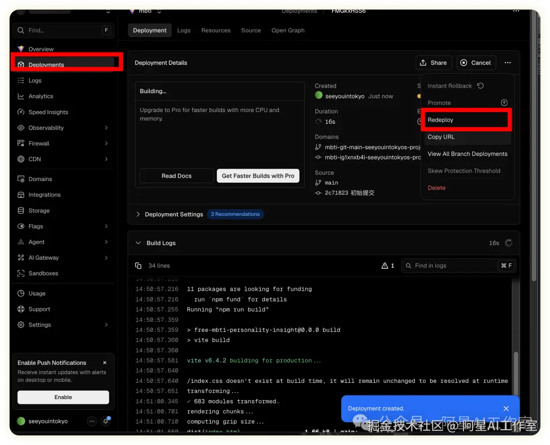 部署后打开站点,做一轮测试到结果页,确认正常返回。需要正式域名就到 Domains 里绑定。