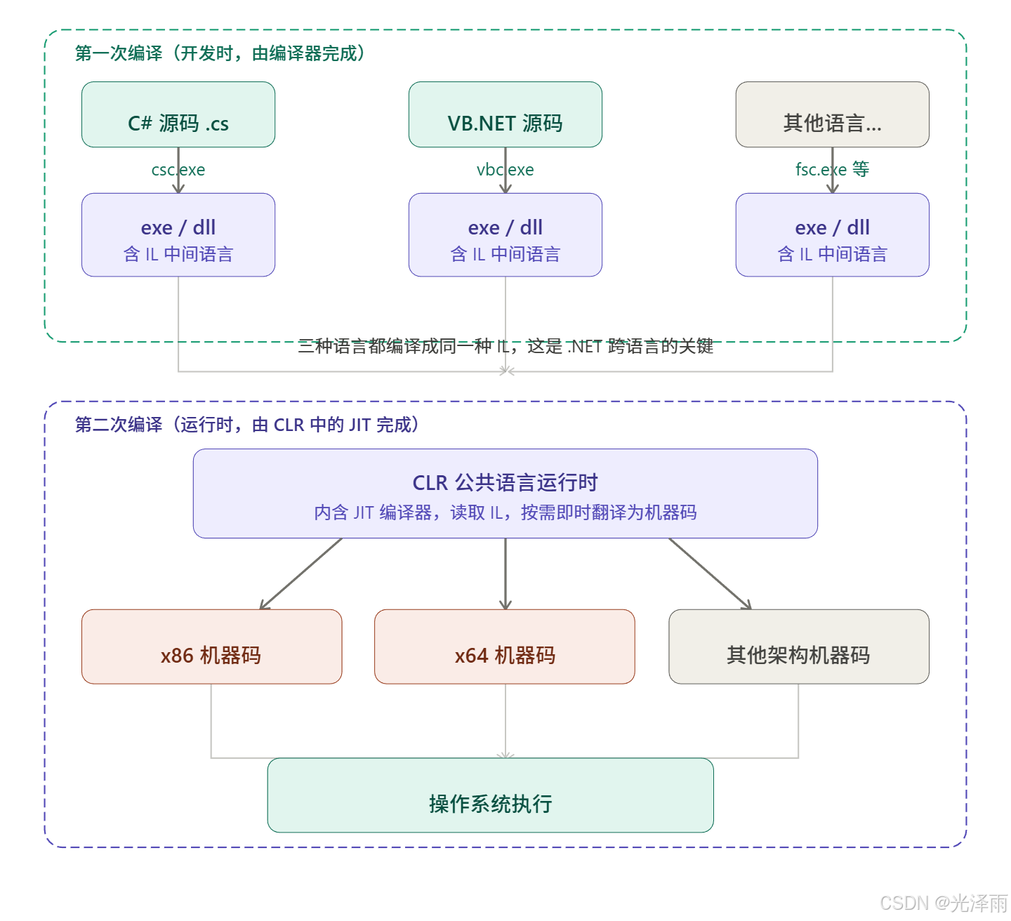 整个流程的核心思路是:.NET 用两次编译把"写代码"和"跑代码"这两件事解耦开来。
