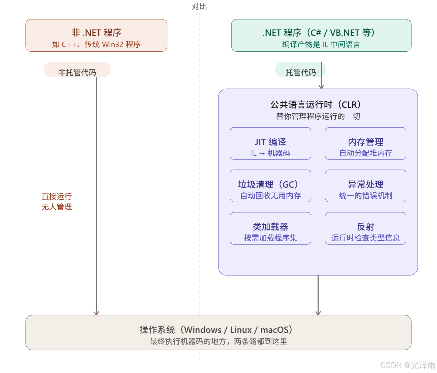 托管代码(C# 就是这类)写的程序,产物是 IL 中间语言,必须交给 CLR 来"代为管理",CLR 再翻译成机器码给操作系统执行。多了这一层,CLR 就能替你做很多事:
