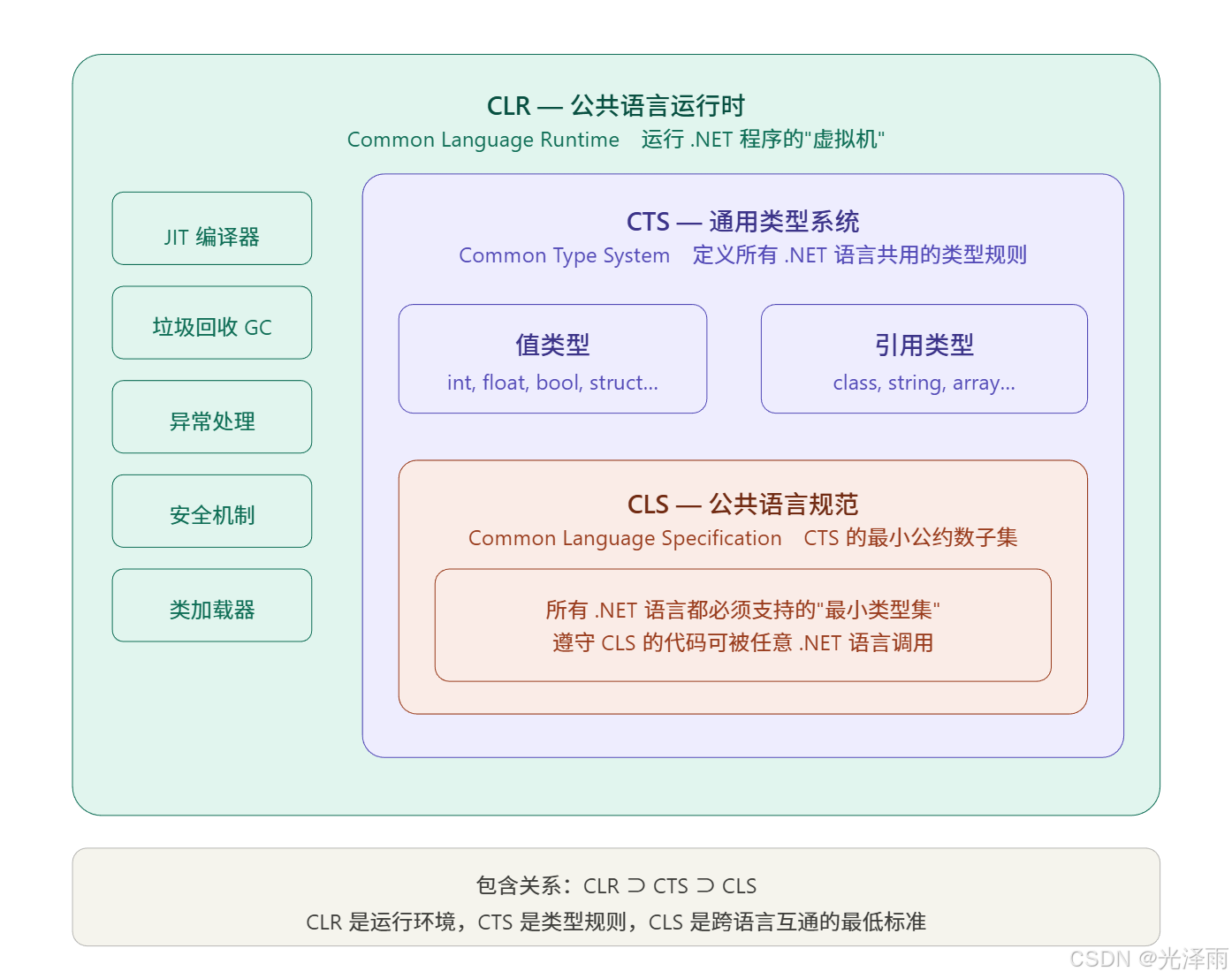 三者是层层包含的关系,从大到小:CLR ⊃ CTS ⊃ CLS。