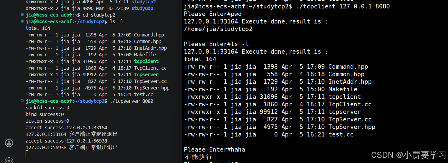 这一部分主要实现一个输入指令,让服务端给我把指令的结果回显到客户端。我也对代码进行了相应的完善了补充。先来看实现效果: