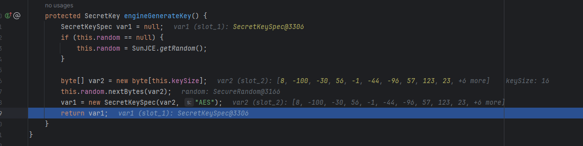 然后步入到这里,可以看见这里生成了一串16字节的随机序列,然后返回了一个SecretKeySpec对象