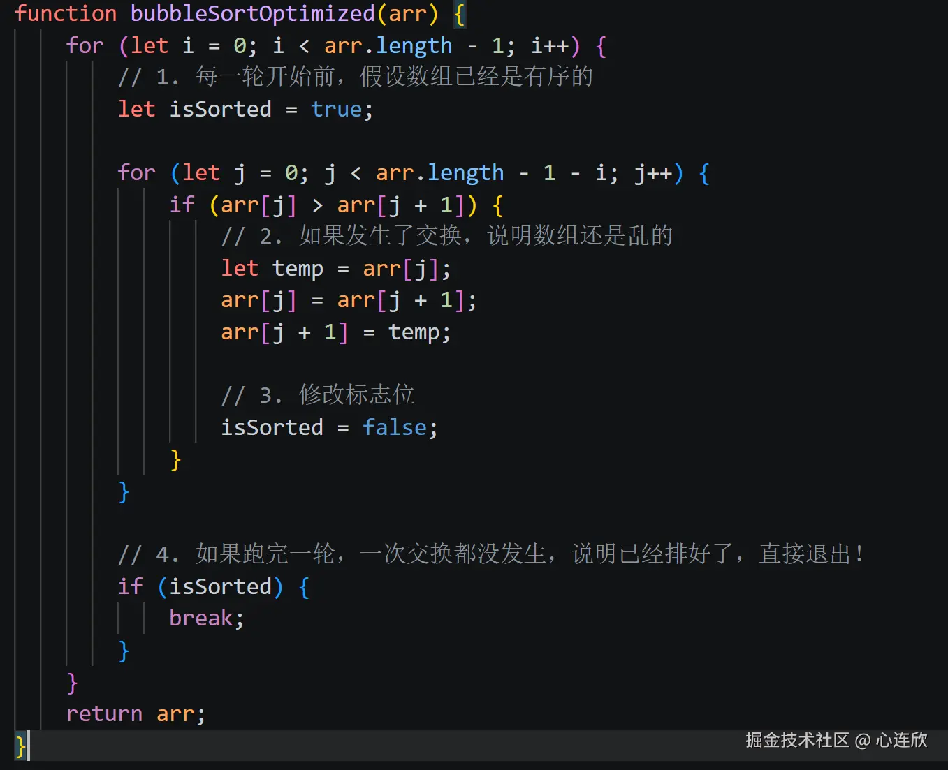 上面的代码有个小缺陷:如果数组本来就是有序的(比如 [1, 2, 3, 4]),它还是会傻傻地跑完所有循环。
