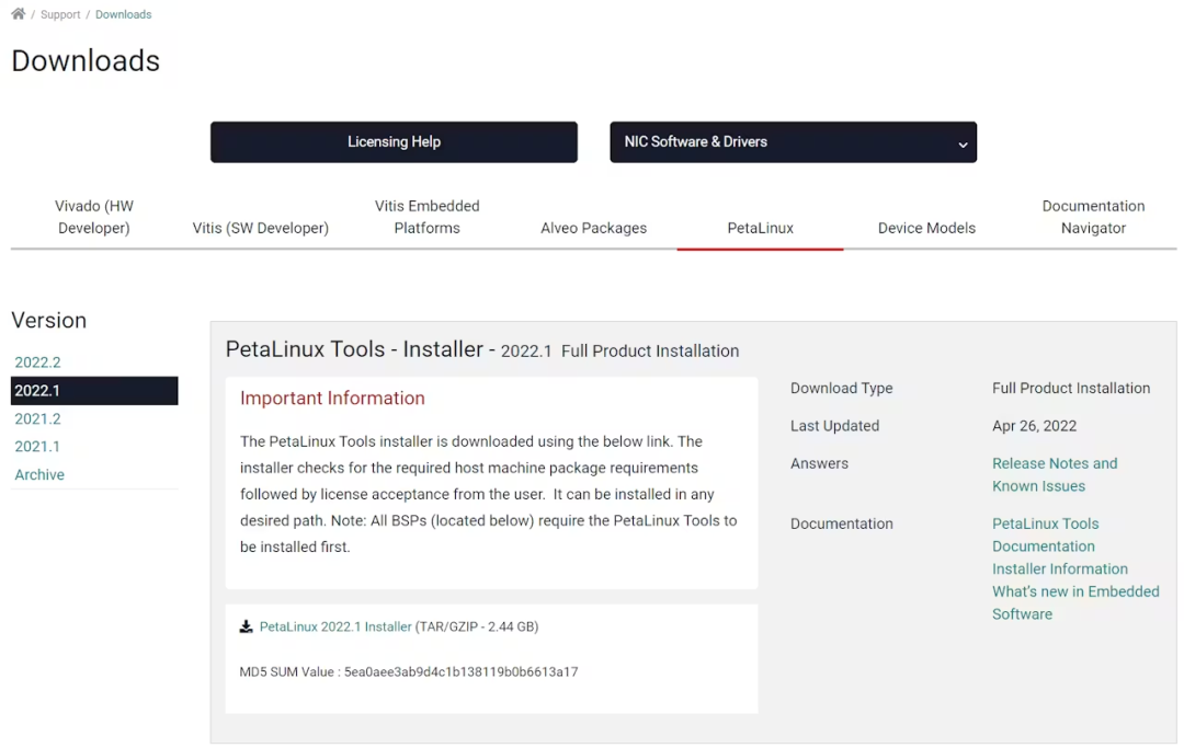 下载 v2022.1 Petalinux 工具: