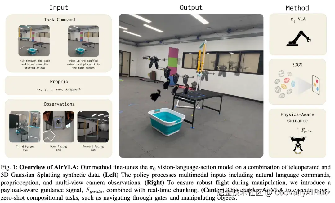 为此,他们提出AirVLA框架,通过两项关键设计解决这一问题:一是载荷感知引导(Payload-Aware Guidance),在推理时将物理约束注入flow-matching采样过程;二是基于3D高斯泼溅(3D Gaussian Splatting)的数据合成管线,从少量真实示教生成多样化训练样本。基于π₀模型微调后,AirVLA在抓取任务中将放置成功率从23.5%提升至50.0%,导航任务Gate通过率从80.0%提升至95.0%,组合任务(先穿门再抓取)达到62.5%的端到端放置成功率。