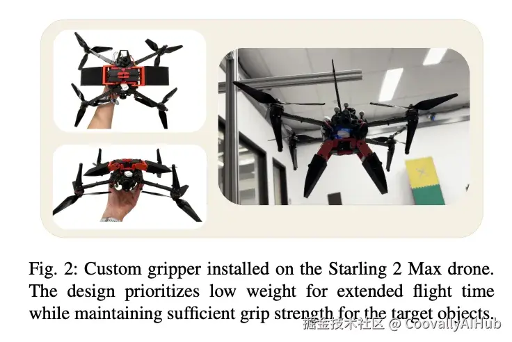 本文的硬件平台为ModalAI Starling 2 Max 四旋翼无人机,搭载定制的UMI风格夹爪和3个RGB摄像头(5Hz采集频率),定位依赖motion capture系统。