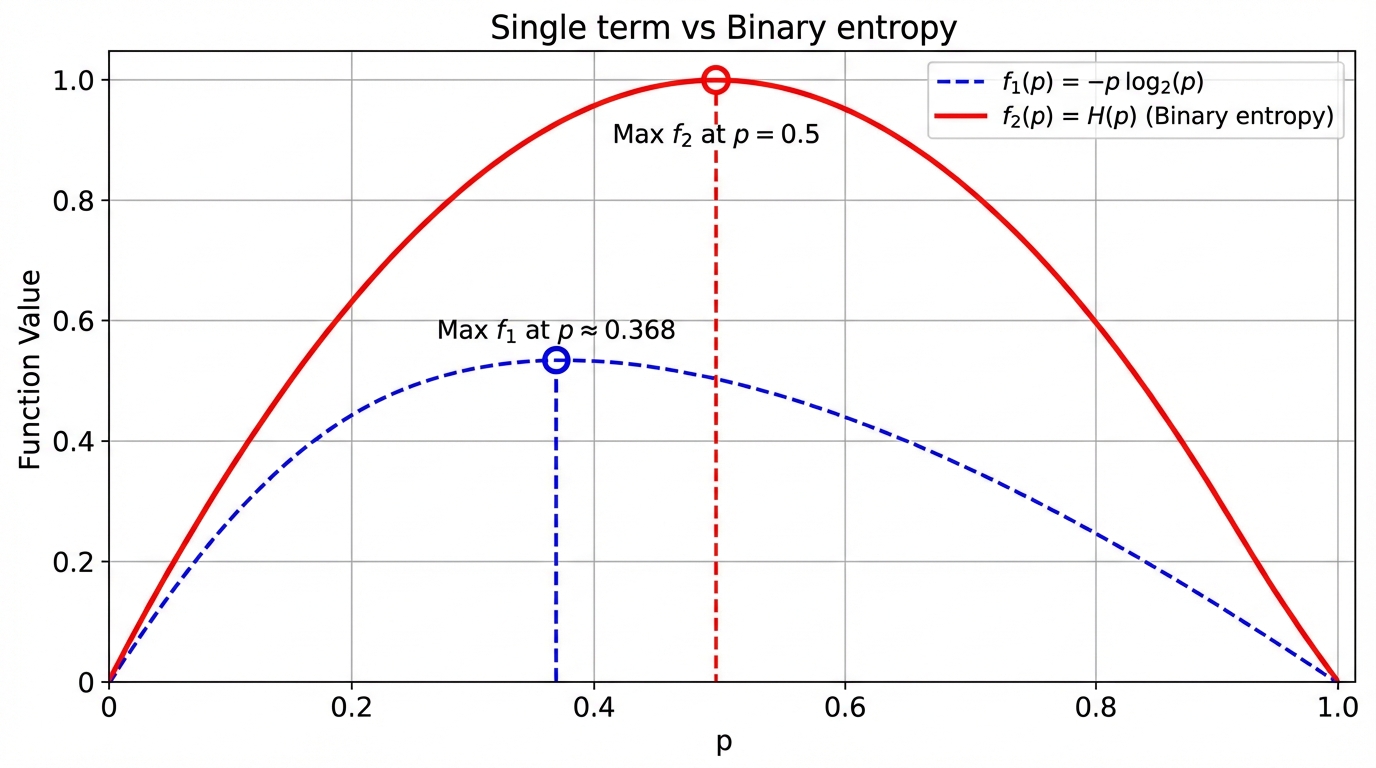 因此,该函数的图像呈现为一个"倒 U 型"。这意味着,单个概率项对不确定性的贡献,在"中等概率"时最大,在"边界概率"时最小。