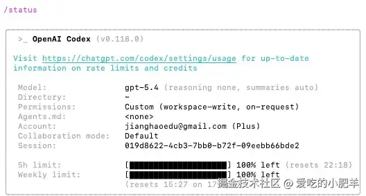 在本地的 Codex CLI 上, 你可以直接执行:/status 指令就可以查看。