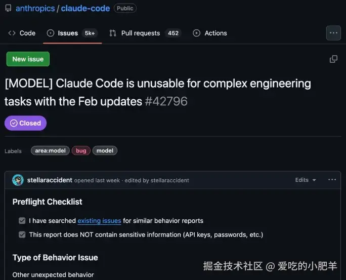 这位老姐直接在 GitHub 上开了个 Issue,标题简单粗暴 ------ 「Claude Code 已经没法用来做复杂工程了」。