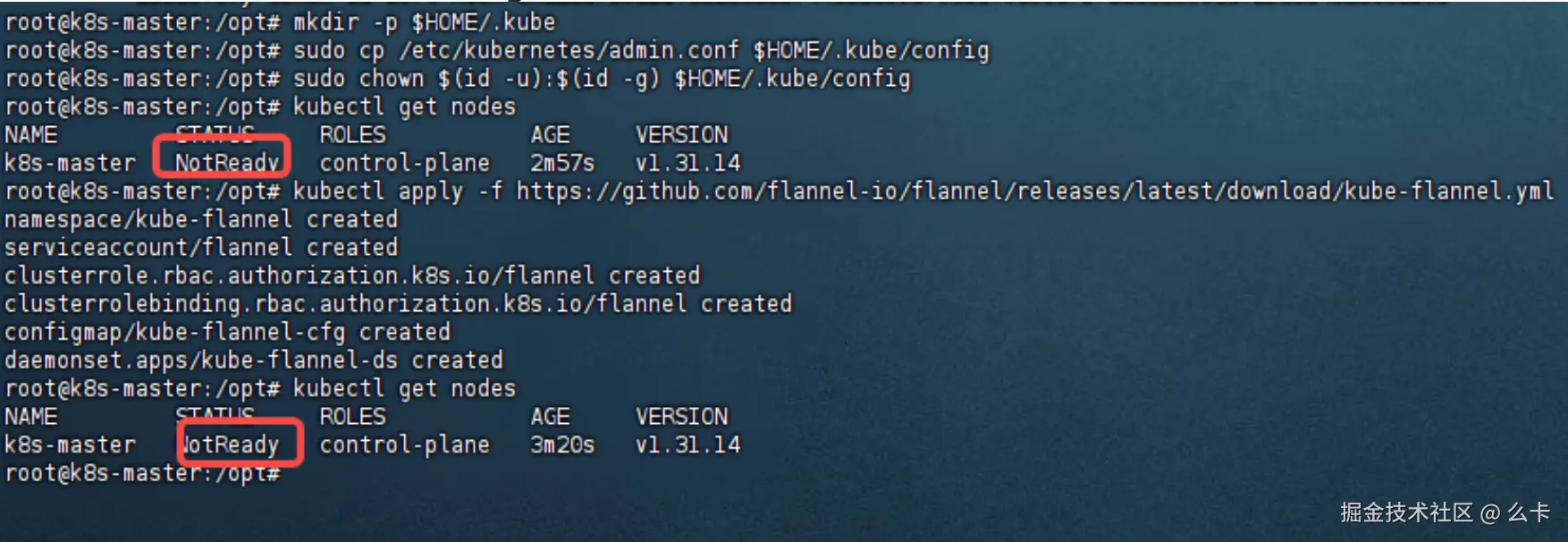 这时候节点状态应该是 NotReady,因为网络插件还没装。别慌,这是正常的。