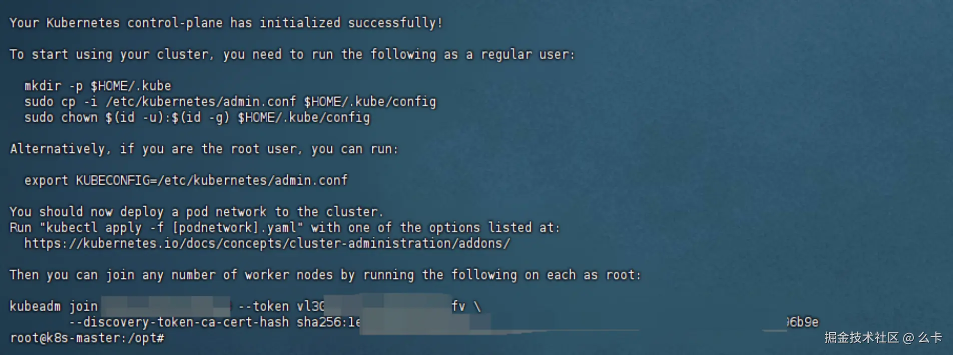 如果一切顺利,最后会输出一段 kubeadm join ... 的命令,一定保存下来!虽然我们是单节点用不上 join,但万一以后想加节点呢?