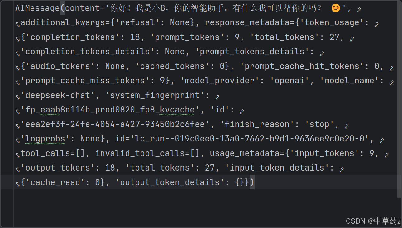 response_metadata:响应元数据。例如:响应标头、logprobs、令牌计数、模型名称。 侧重于 "响应"本⾝的信息,⽐如这次请求的 ID、使⽤的模型版本、以及服务提供商返回的所有原始元数据。它主要⽤于调试、⽇志记录和获取请求的上下⽂信息。