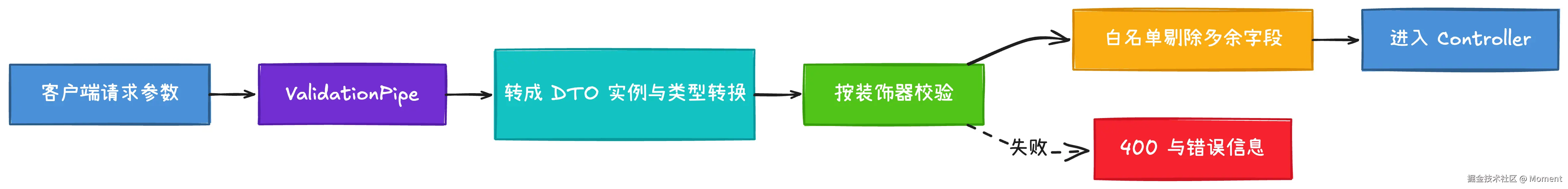 实际顺序可以粗略理解成:先尽量转成 DTO 实例并做类型转换,再跑 class-validator,最后按白名单剥掉多余属性。校验失败会在进入控制器之前返回,不会混进半合法对象。