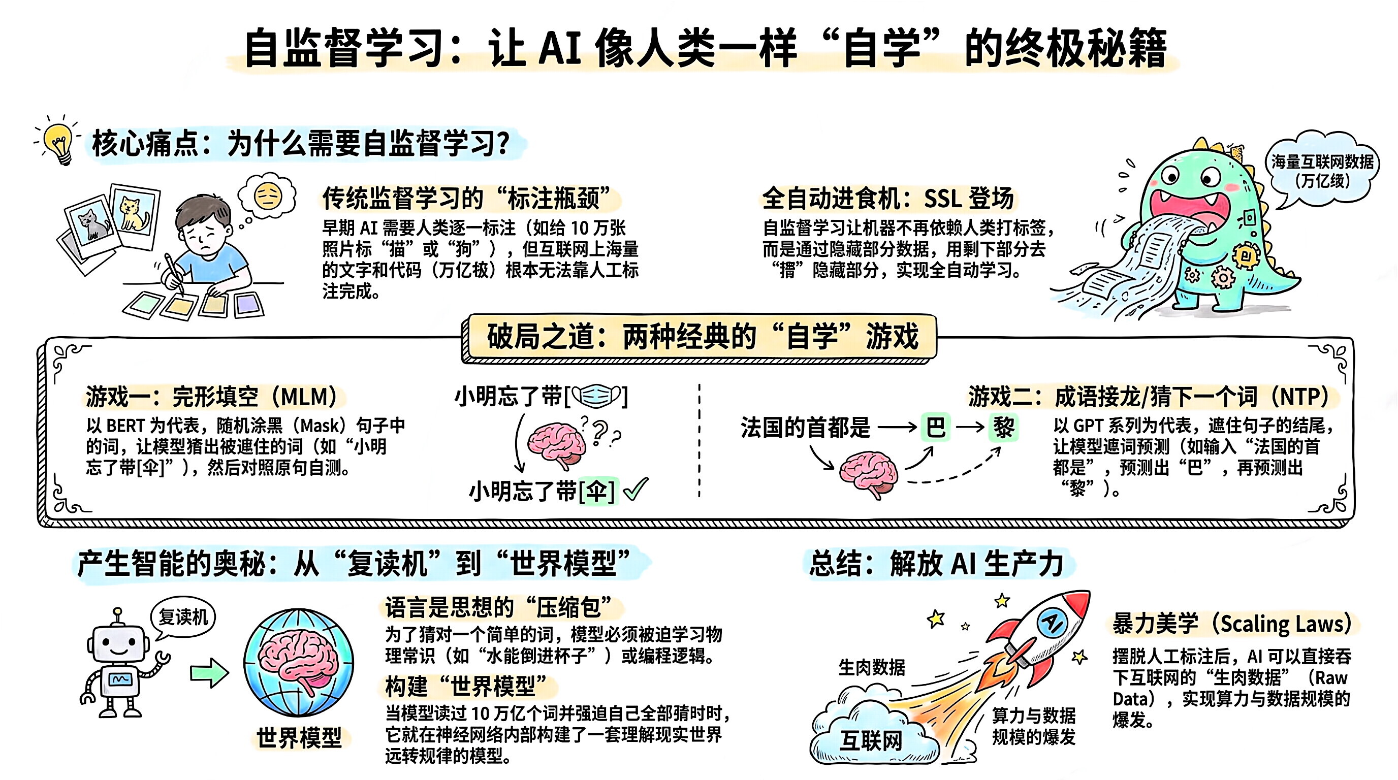 如果说大模型是一头吞噬数据的巨兽,那么自监督学习就是它的**"全自动进食机"** 。