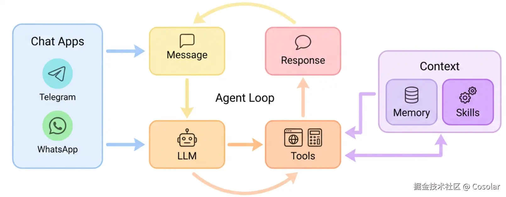 - 极简主义(Minimalism):剔除冗余抽象层,核心代码控制在 4,000 行左右。这意味着开发者可以在数小时内通读源码,理解其消息流转、上下文管理、工具调用等底层逻辑。
