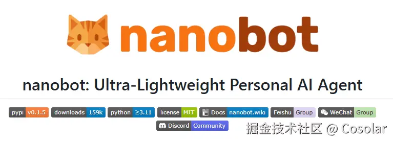 在此背景下,由香港大学数据科学实验室(HKUDS)开源的 Nanobot 框架应运而生。它以"少即是多"为核心理念,仅用约 4,000 行核心代码便实现了一套完整、可生产级别的 AI Agent 系统。本文将从技术架构、核心模块、部署实战、应用场景及生态定位等维度,对 Nanobot 进行深度剖析,为开发者提供一份系统性的技术参考。