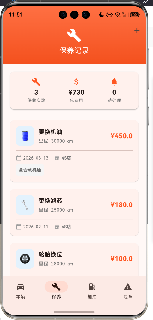 应用以活力橙红为主色调,象征热情与动力。涵盖车辆信息、保养管理、加油记录、违章查询四大核心模块。用户可以记录车辆保养历史、追踪油耗变化、管理违章信息、分析用车成本,实现车辆管理的智能化和便捷化。