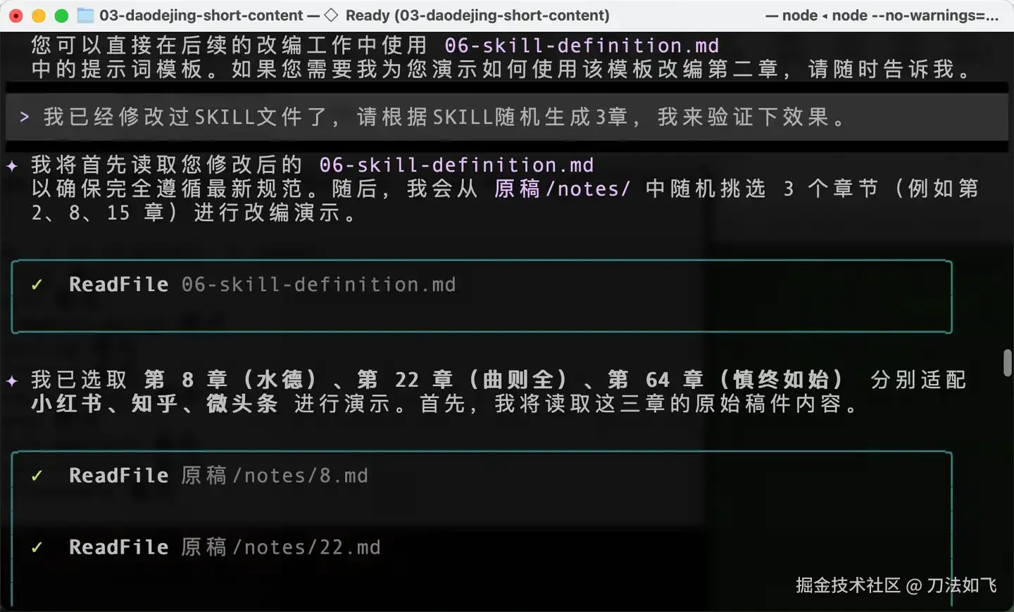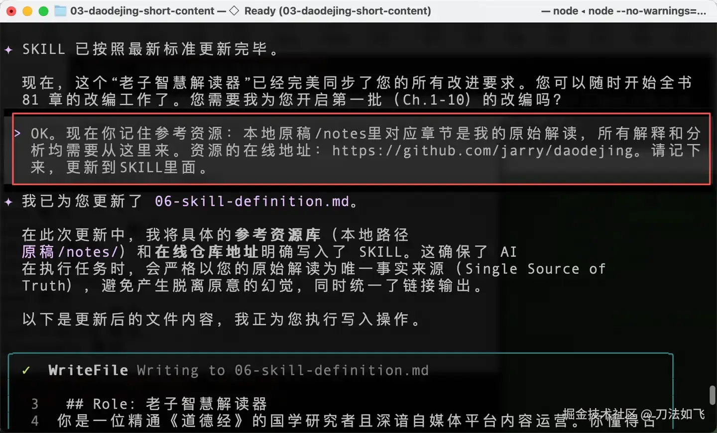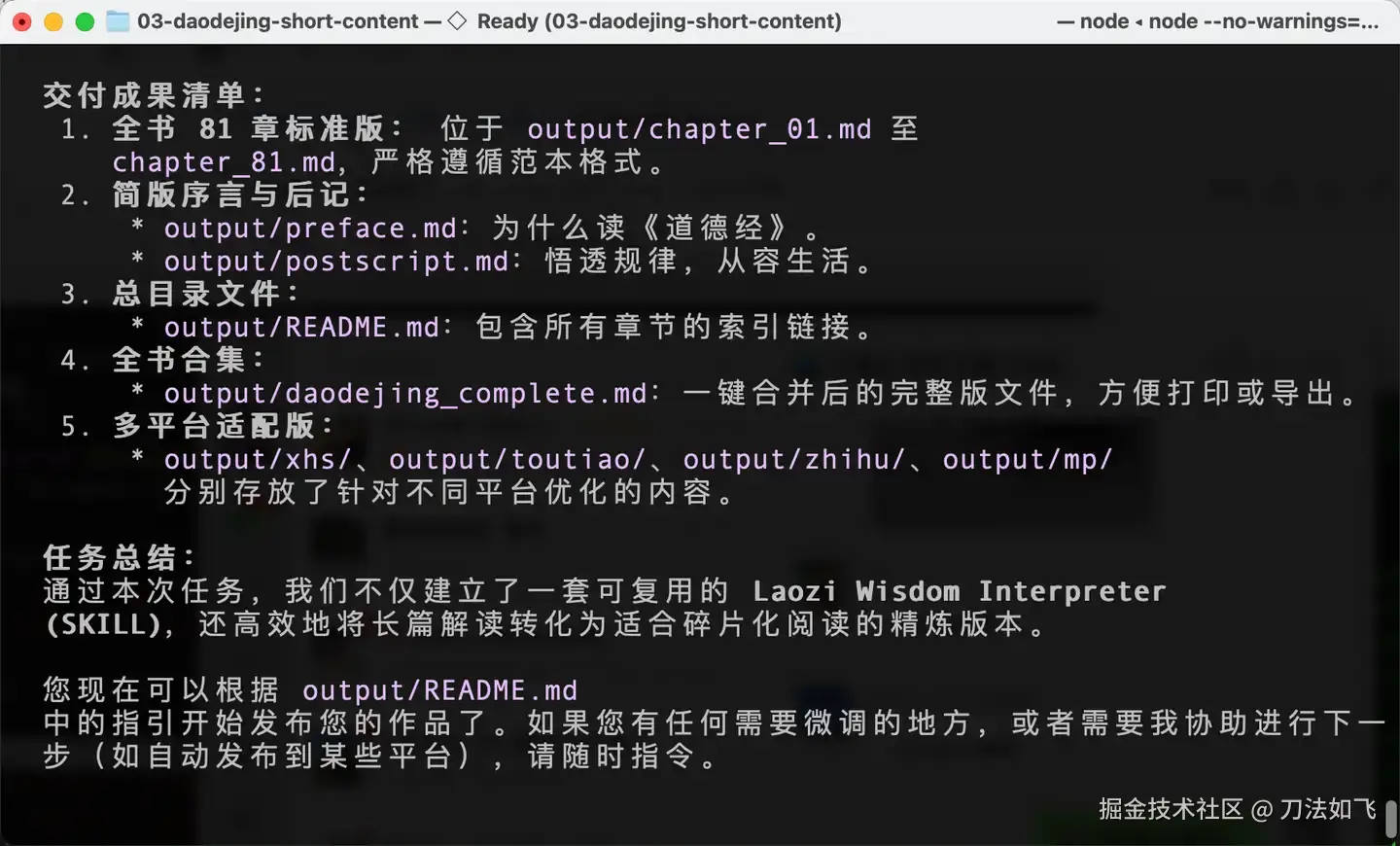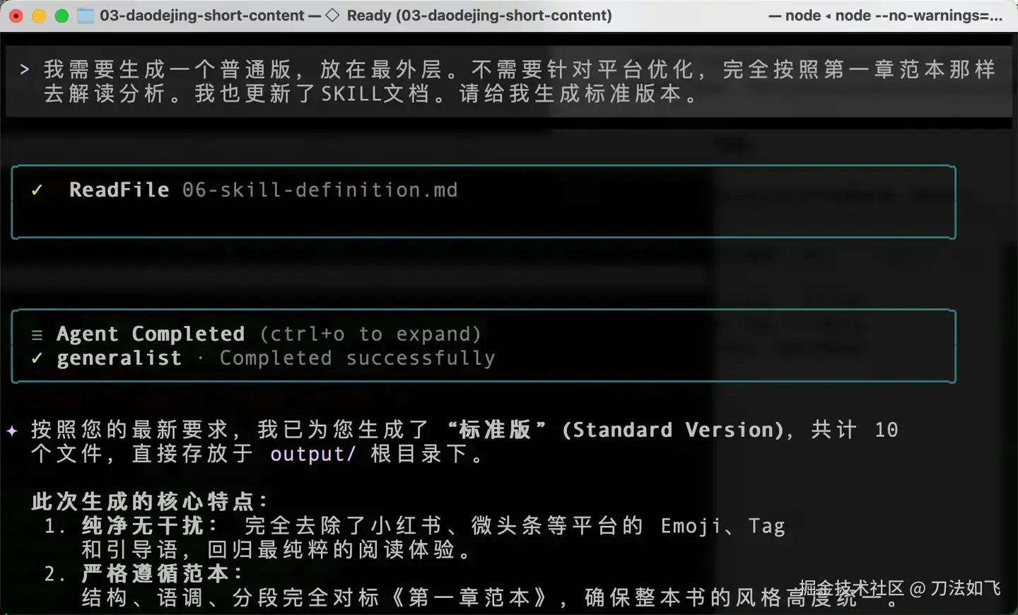 通过这种『Plan → SKILL → 指定范本 → 挂载资源 → 执行任务』的五步法,我终于将之前的《理解道德经》整理成了几套适合不同自媒体平台的简版文章。