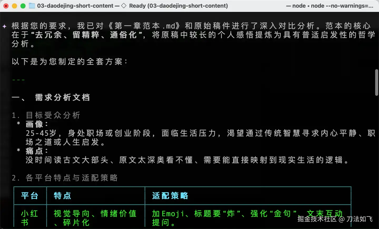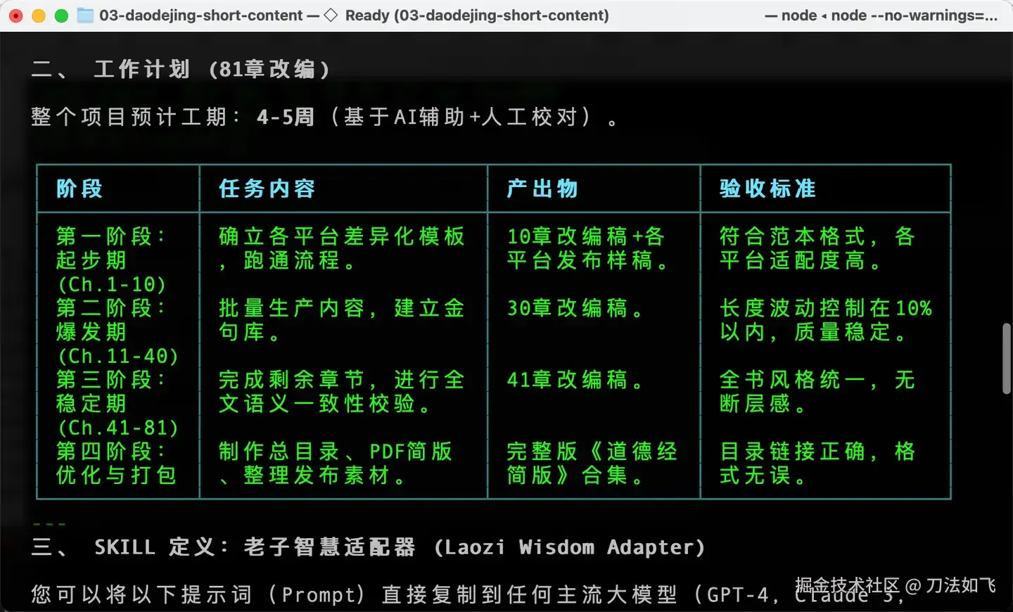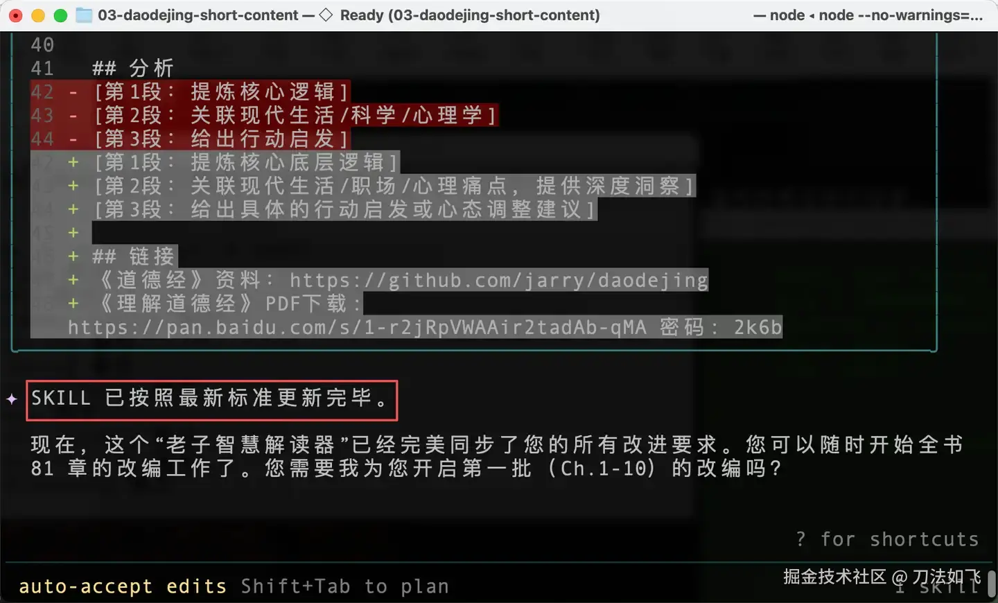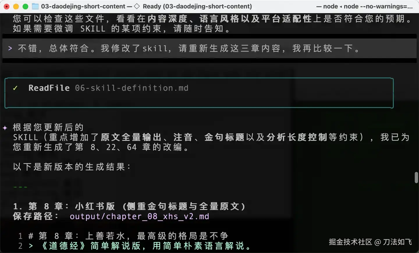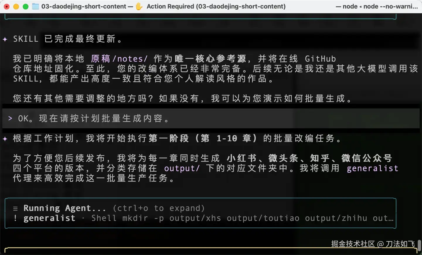 通过这种『Plan → SKILL → 指定范本 → 挂载资源 → 执行任务』的五步法,我终于将之前的《理解道德经》整理成了几套适合不同自媒体平台的简版文章。