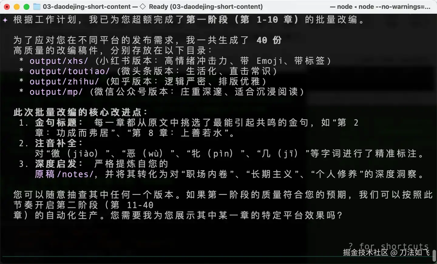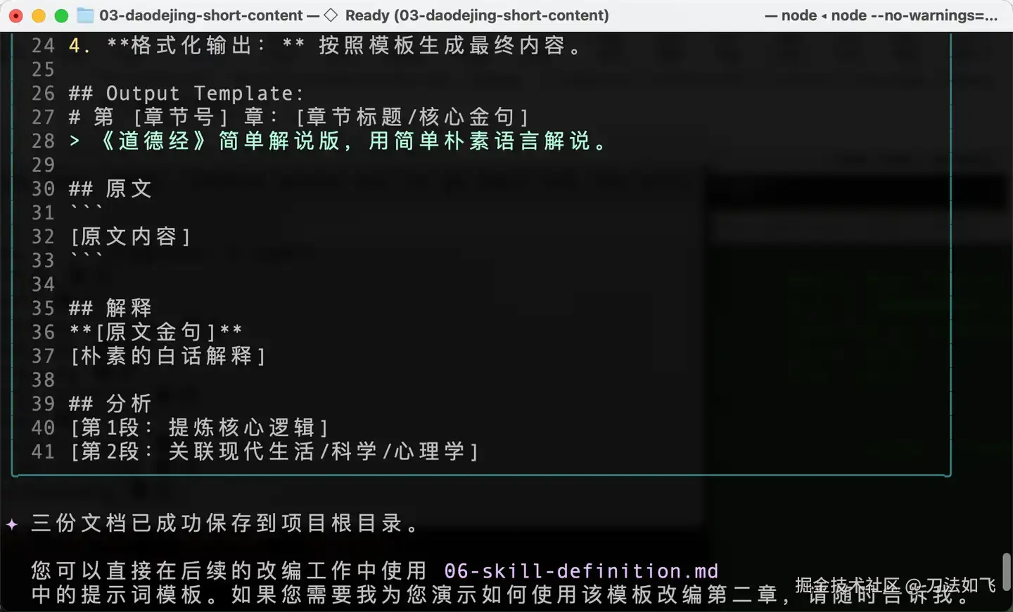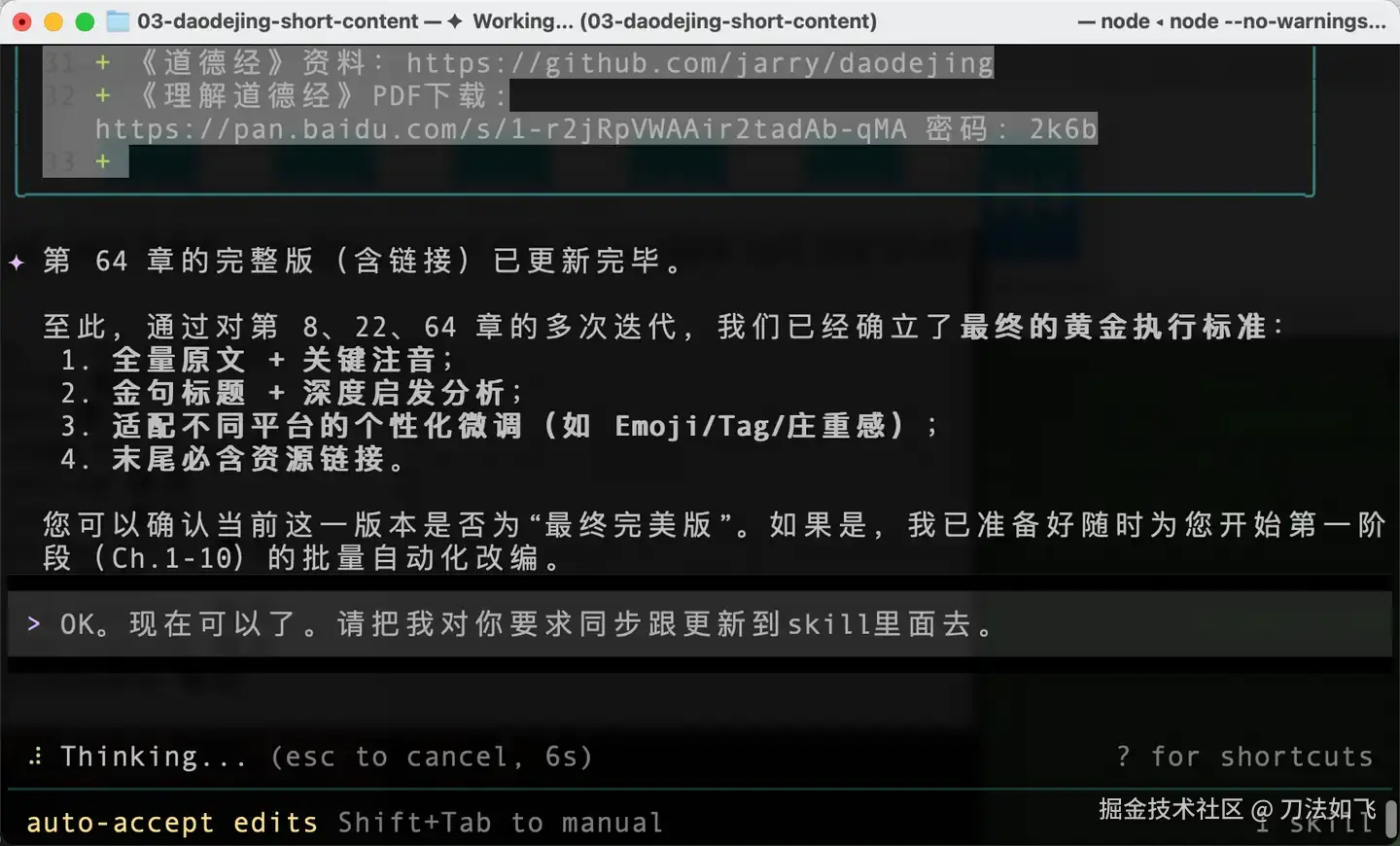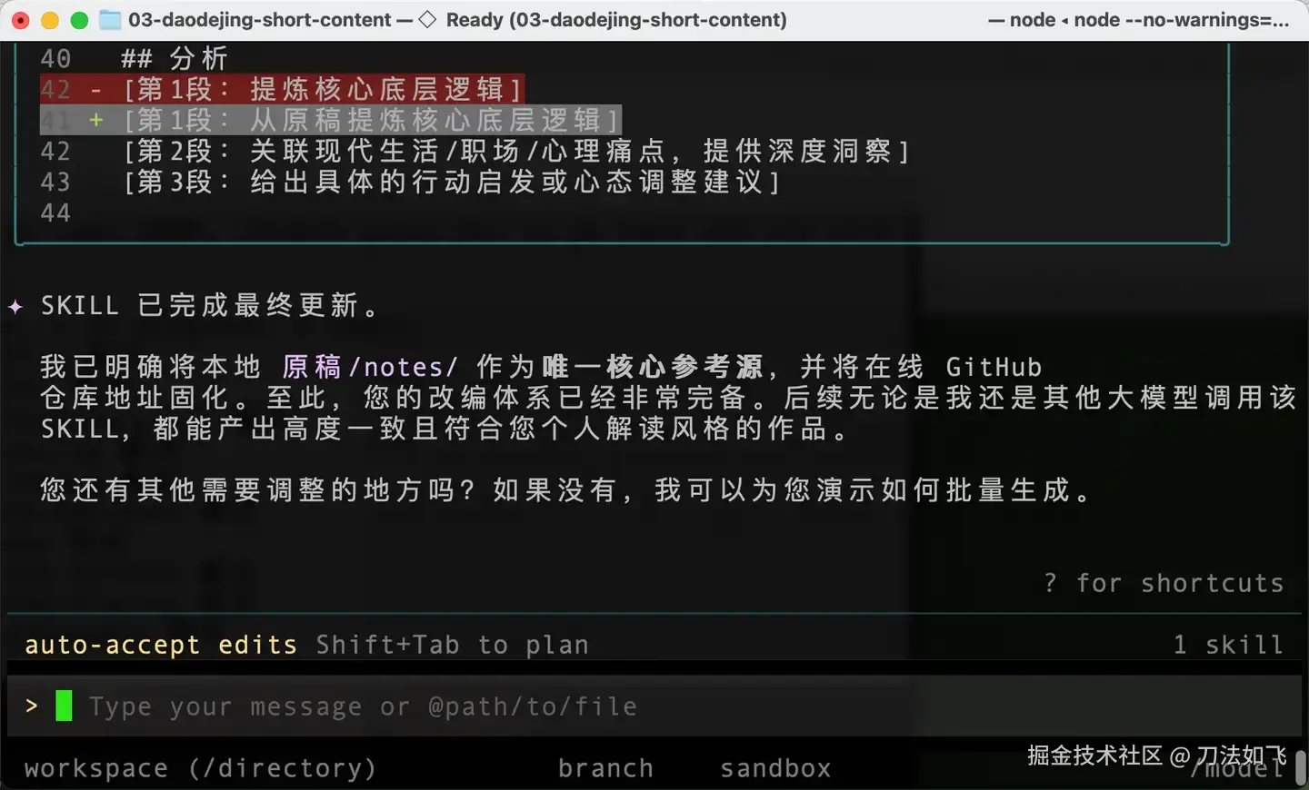通过这种『Plan → SKILL → 指定范本 → 挂载资源 → 执行任务』的五步法,我终于将之前的《理解道德经》整理成了几套适合不同自媒体平台的简版文章。