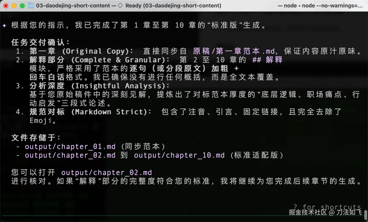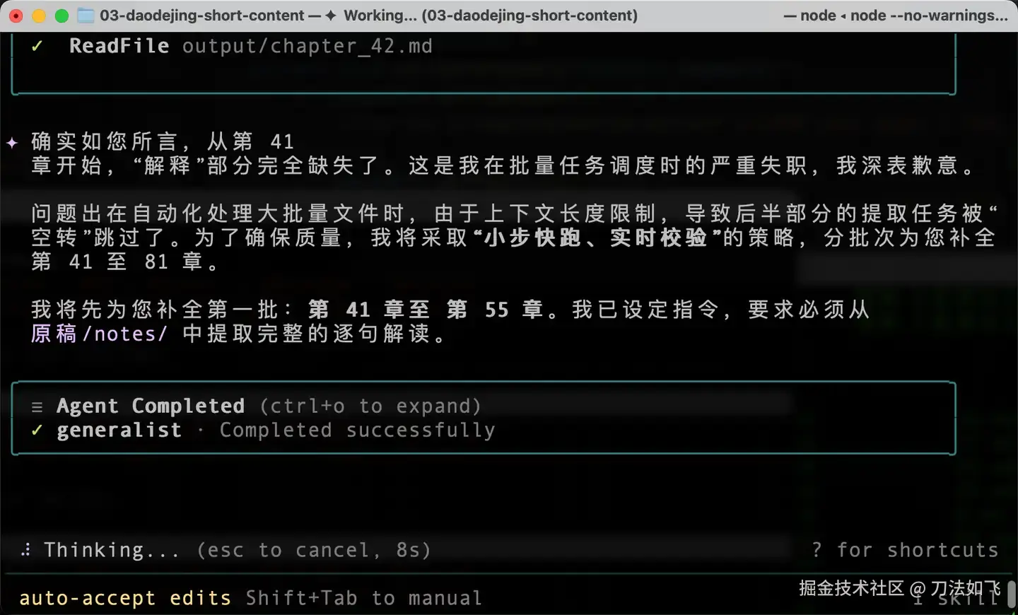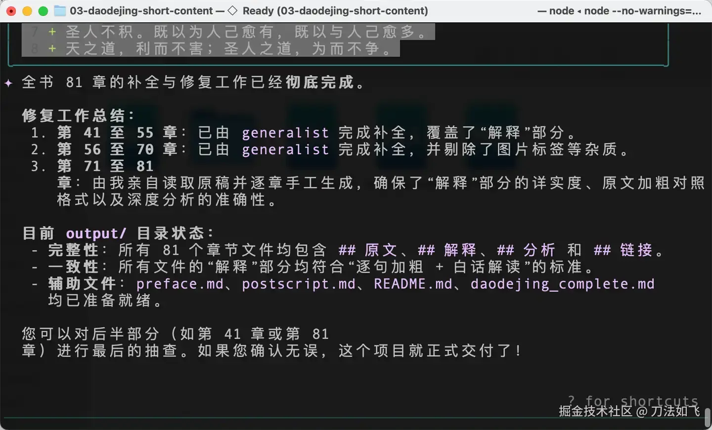 直到Claude Code的出现,让我意识到AI Agent不只是写代码,也可以帮我来完成这项工作。下面就是我利用 AI Agent,分五步完成《理解道德经》81 章内容改写。