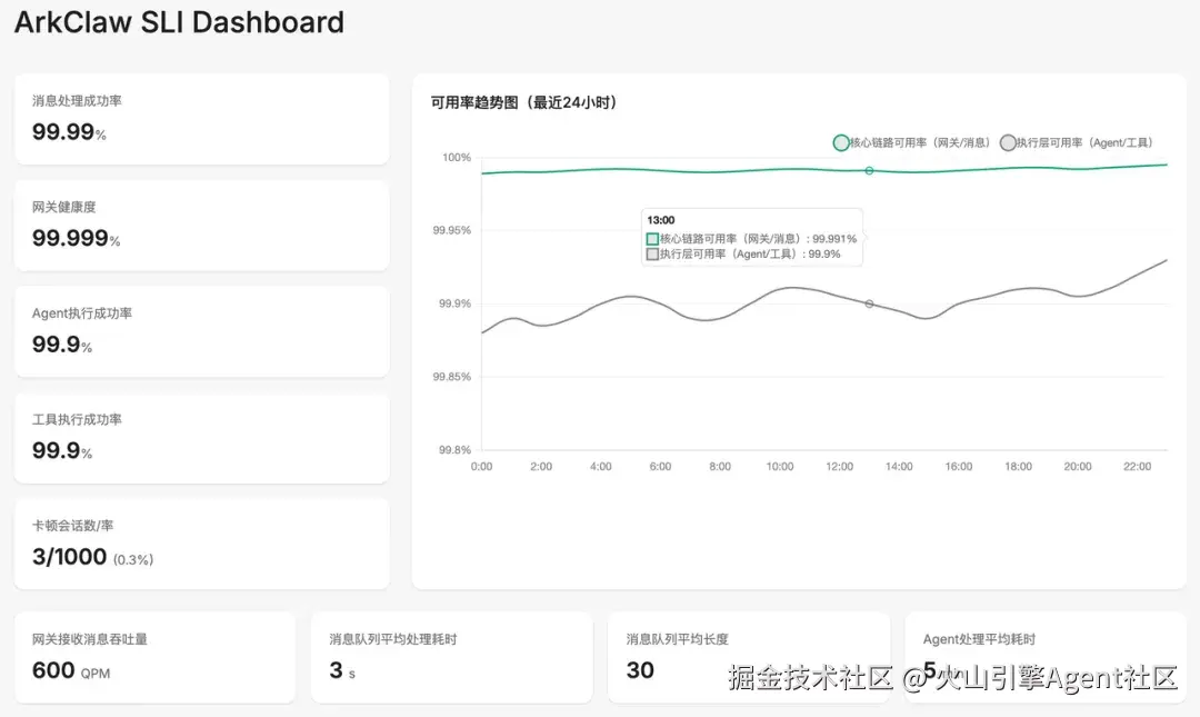 ArkClaw 进一步提供了开箱即用的 SLI 观测大盘(Dashboard) ,帮助开发者从"指标定义"走向"实时可视化与问题定位",详细请登录控制台查看,示例如下图:
