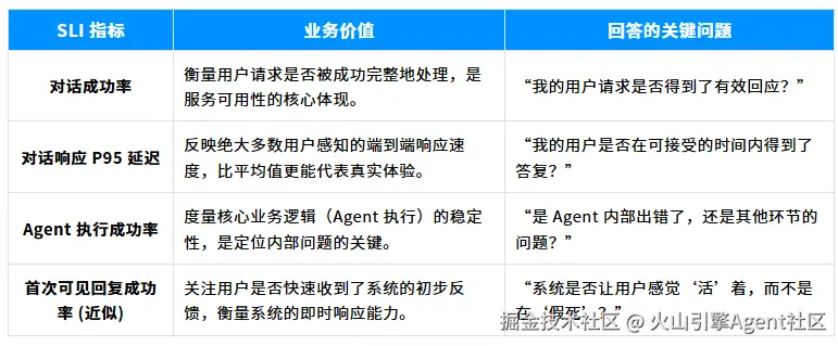 1. SLI 指标设计 (SLI Design): 基于统一的数据语义,我们需要定义出一组真正能够反映服务质量的核心 SLI 指标。例如,对话成功率、端到端响应延迟(P95)、Agent 执行成功率等。这些指标不再是模糊的"体感",而是可以量化、可以承诺、可以告警的业务语言。