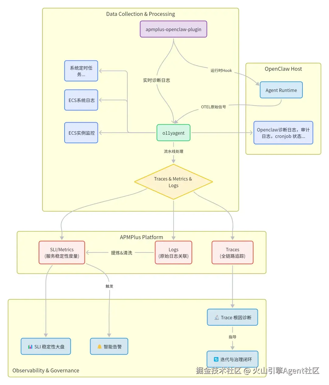 在 ArkClaw 场景,o11yagent 把来自 OpenClaw 运行时与宿主环境的信号,整理为可统一查询、可派生 SLI、可治理的数据资产。