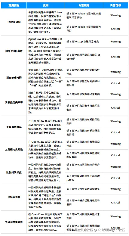 单单"看得清"还不够,更重要的是在问题发生前就收到预警。ArkClaw 的可观测性不仅用于事后复盘,也延伸到主动防御:提供一套开箱即用的监控与告警体系,让你的"虾"在异常行为刚出现时就能被及时发现。