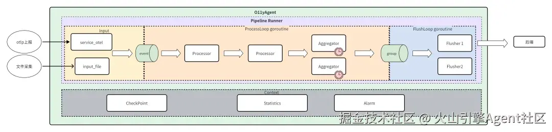 可观测数据采集还依赖一个核心组件:observability-agent(o11yagent) ,O11yAgent 是可观测团队提供的新一代可观测性数据 [M.T.L.E] 采集和处理管道,具有丰富的开源协议对接,主动采集,数据清洗及加工能力。