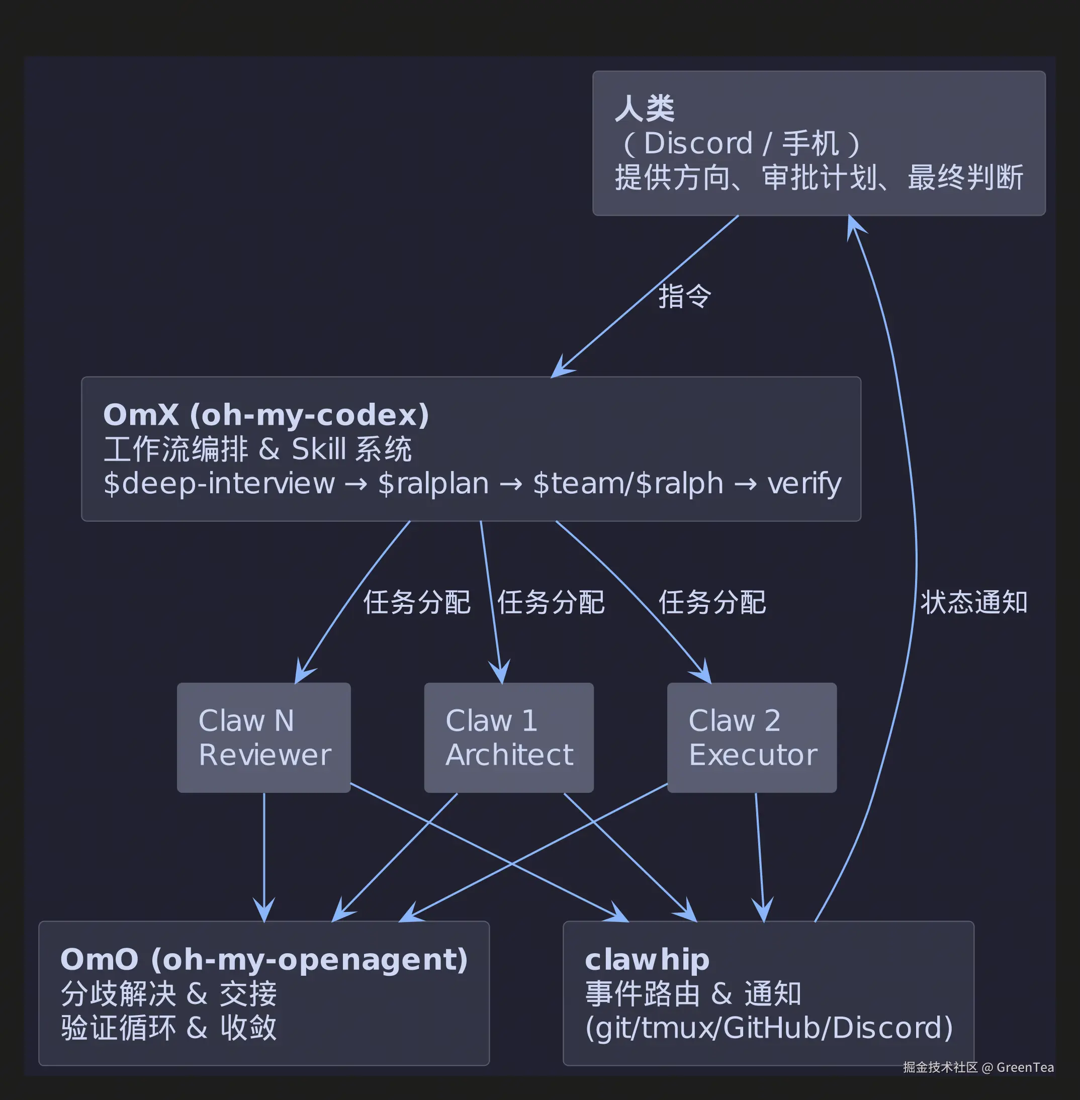 - clawhip 负责在 Agent 工作时将通知路由到 Discord,而不是挤占 Agent 的上下文窗口