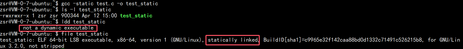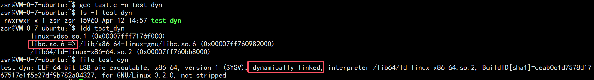 gcc code.c -o code_dyn ls -l code_dyn # 体积约 8KB ldd code_dyn # 显示依赖 libc.so.6 file code_dyn # 显示 dynamically linked