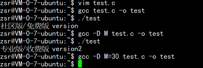 gcc -D M code.c -o code # 定义 M,输出"专业版" gcc code.c -o code # 不定义 M,输出"免费版" gcc -D M=100 code.c -o code # 定义宏并赋值